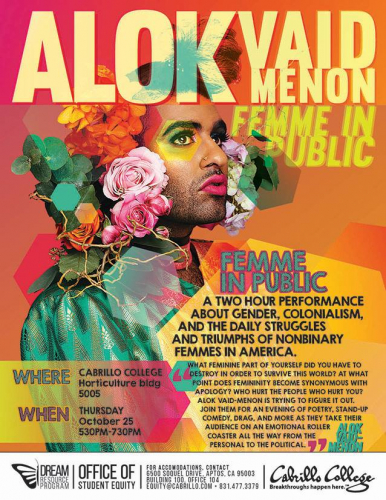 What feminine part of yourself did you have to destroy in order to survive this world? At what point does femininity become synonymous with apology? Who hurt the people who hurt you? Alok Vaid-Menon is trying to figure it out. Join them for an evening of poetry, stand-up comedy, drag, and more as they take their audience on an emotional roller coaster all the way from the personal to the political.