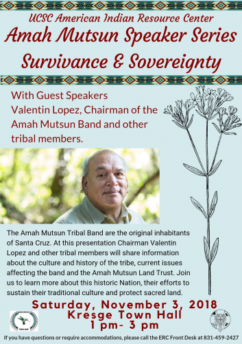 The Amah Mutsun Tribal Band are the original inhabitants of Santa Cruz. At this presentation Chairman Valentin Lopez and other tribal members will share information about the culture and history of the tribe, current issues affecting the band and the Amah Mutsun Land Trust. Join us to learn more about this historic Nation, their efforts to sustain their traditional culture and protect sacred land.