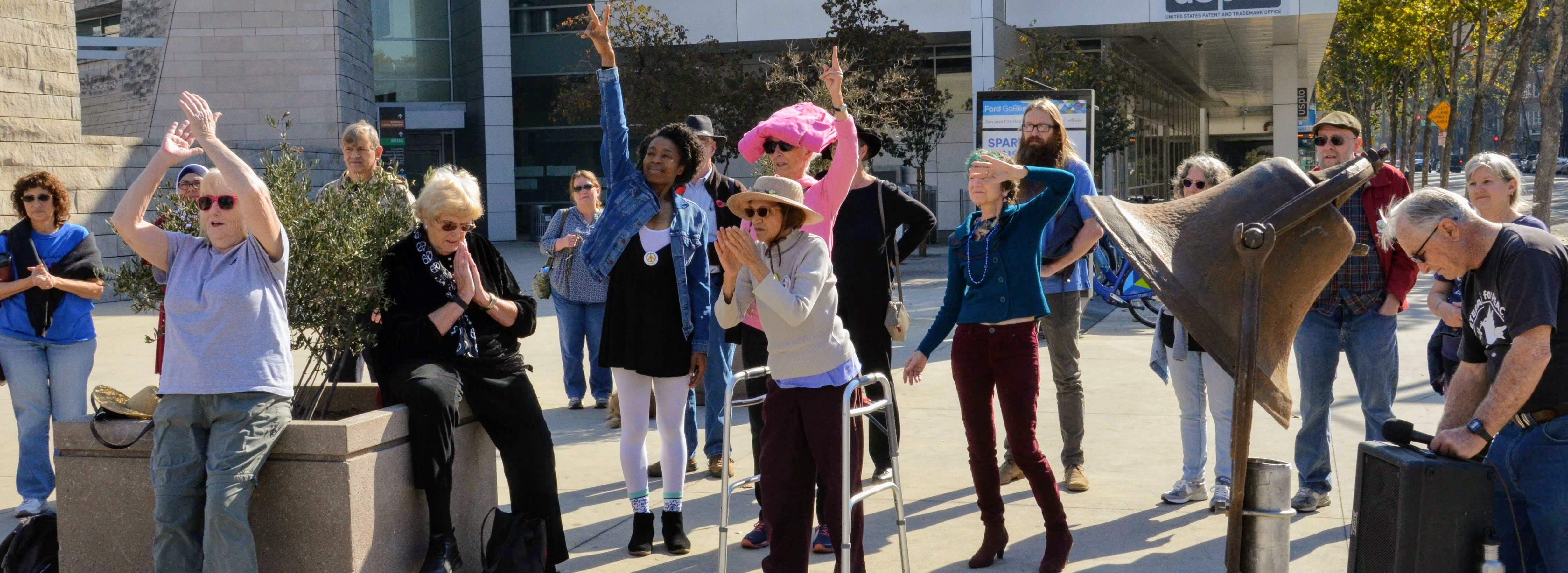 A gathering of Veterans for Peace and allies began with solemn tone at 10:30am yesterday in the plaza at San José City Hall. After ritual bell ringing and a moment of silence for those lost in war, the vigil took a joyous turn as area activists shared messages of peace and joined together in music and dance.