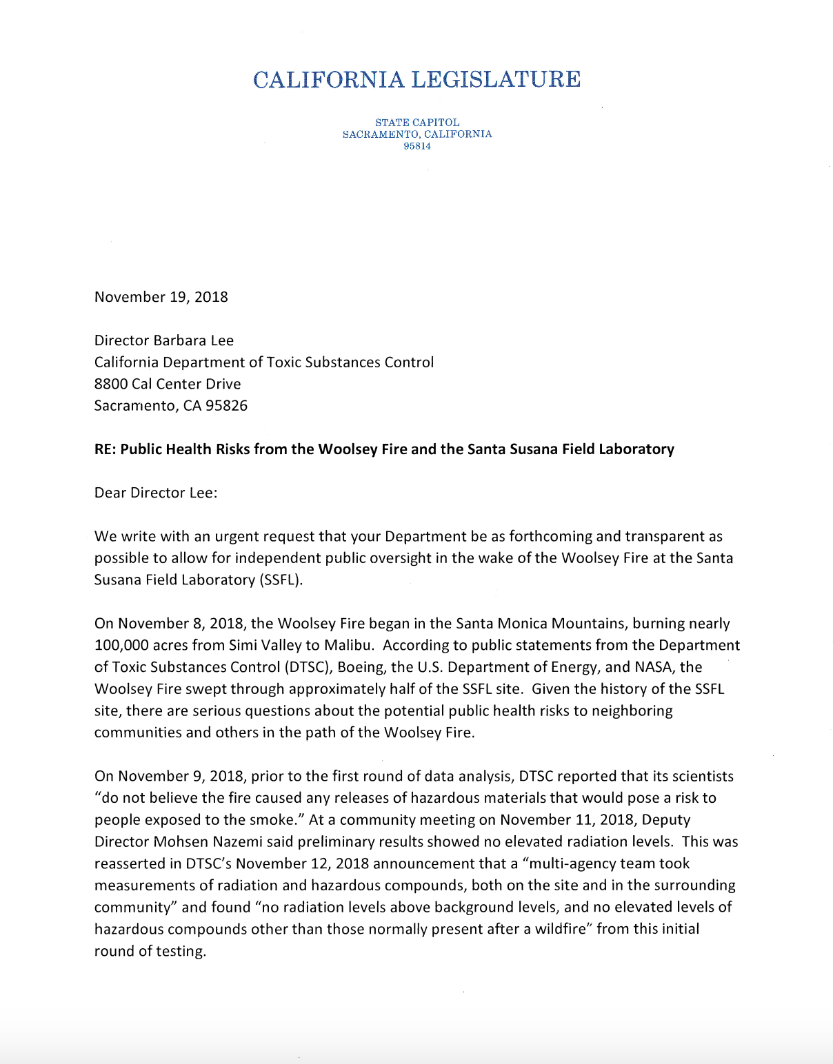 We write with an urgent request that your Department be as forth coming and transparent as possible to allow for independent public oversight in the wake of the Woolsey Fire at the Santa Susana Field Laboratory (SSFL).