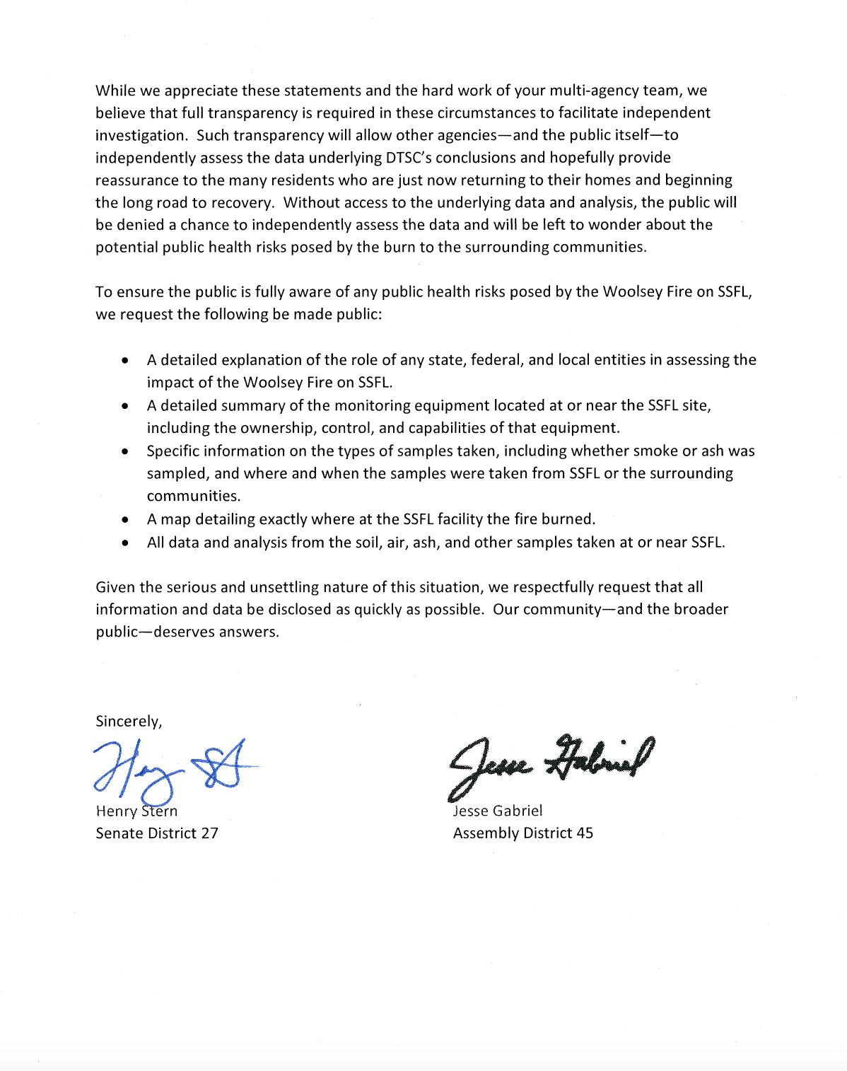 Senator Stern and Assemblymember Gabriel outline five specific requests regarding transparency from the DTSC, and conclude, "Given the serious and unsettling nature of this situation, we respectfully request that all information and data be disclosed as quickly as possible. Our community—and the broader public—deserve answers."