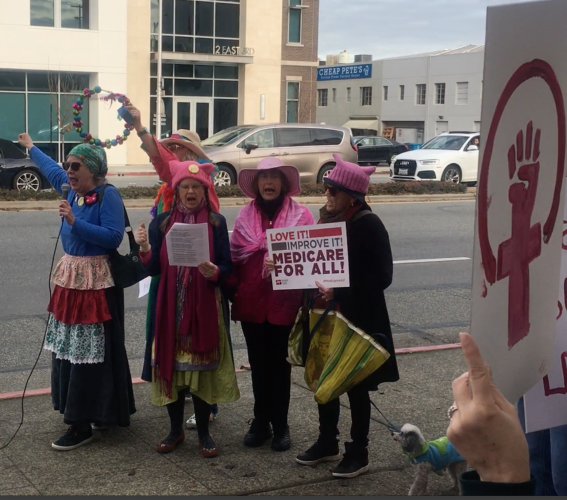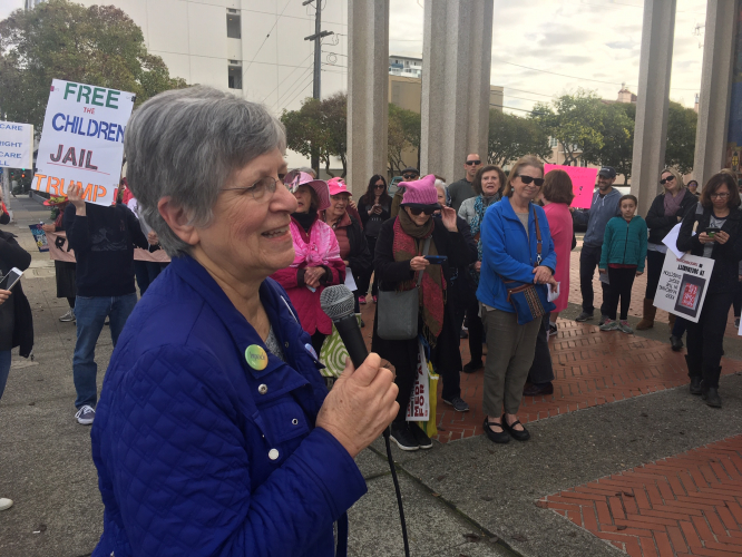 Harini Krishnan of Indivisible SF Peninsula CA-14 led the long version of We Shall Overcome recalling the songs of the civil rights era. On the same theme, the Raging Grannies welcomed the crowd to shout out verses to the traditional tune "Ain't Gonna Let Nobody Turn Me Around." Some of the audience contributions included mercenary wars, charter schools, nuclear armament, agribusiness, PG&E and patriarchy. As in, "Ain't gonna let the patriarchy turn me around!"