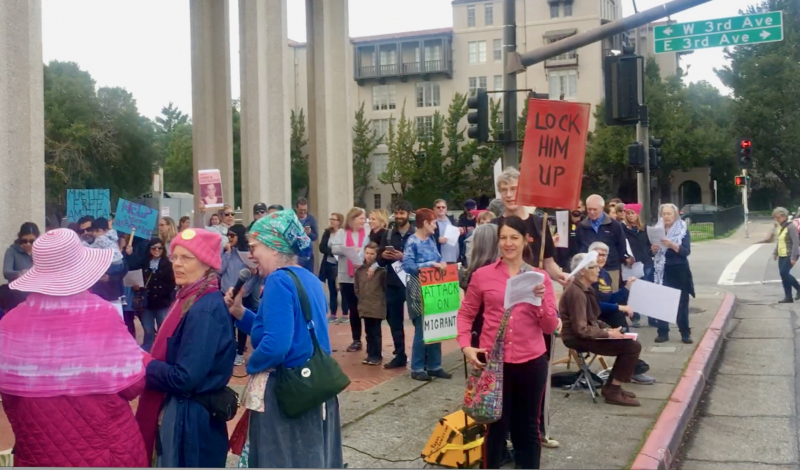 Between San Francisco and San Jose where large marches took place, a smaller rally reverberated with a singalong featuring tunes on the topics of women's rights, immigration rights, and the dream of a society free of corporate dominance.