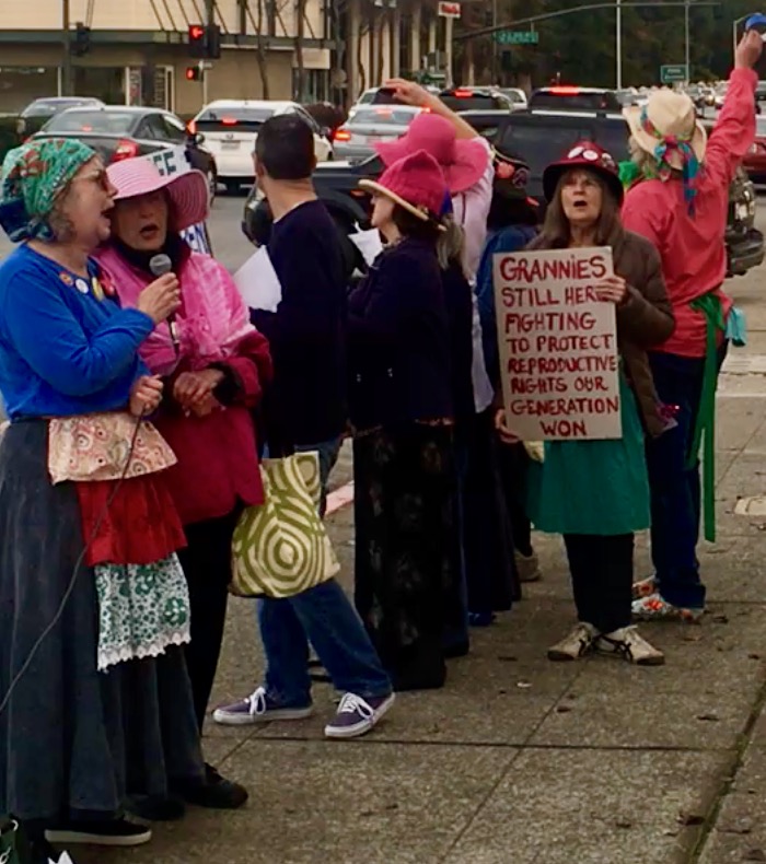 It was not a march but a rally on a sunny day in downtown San Mateo. Many of the participants were women were "of a certain age." One carried a sign that read "Grannies Still Here Fighting to Protect Reproductive Rights Our Generation Won."