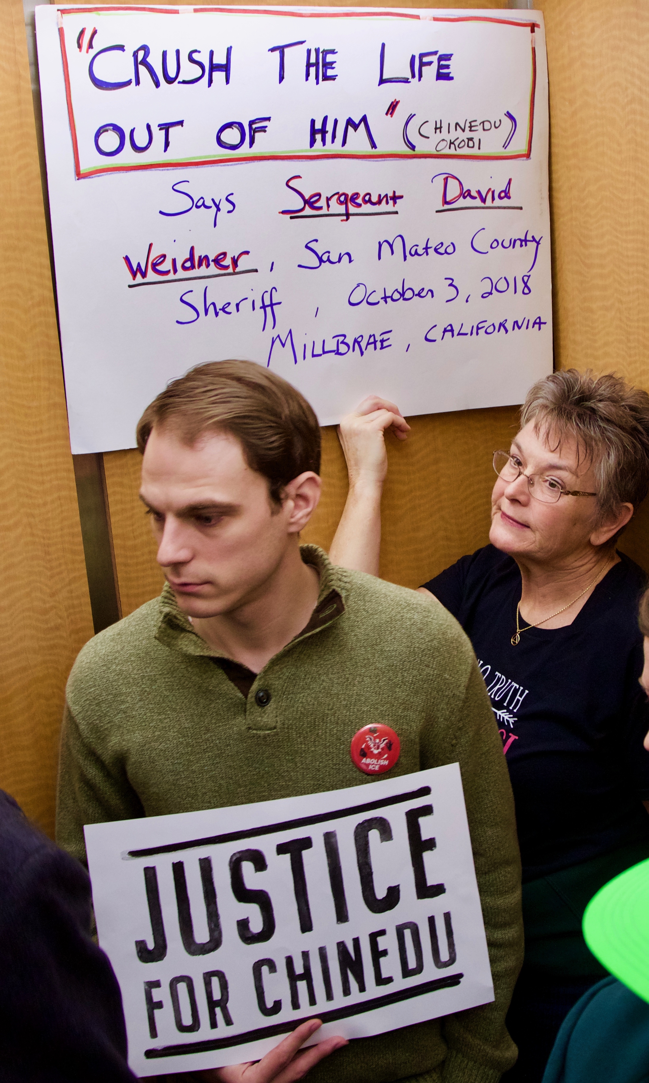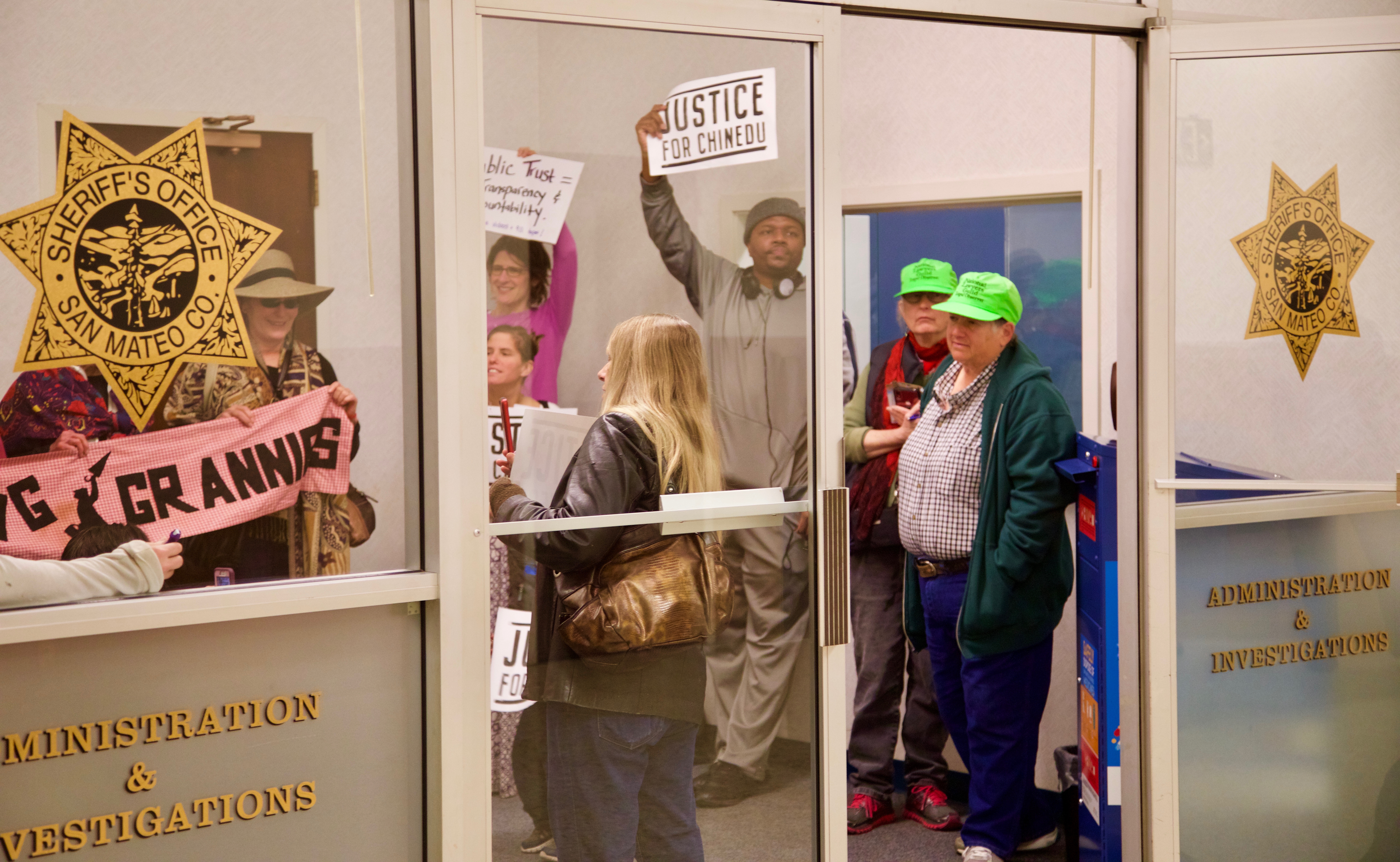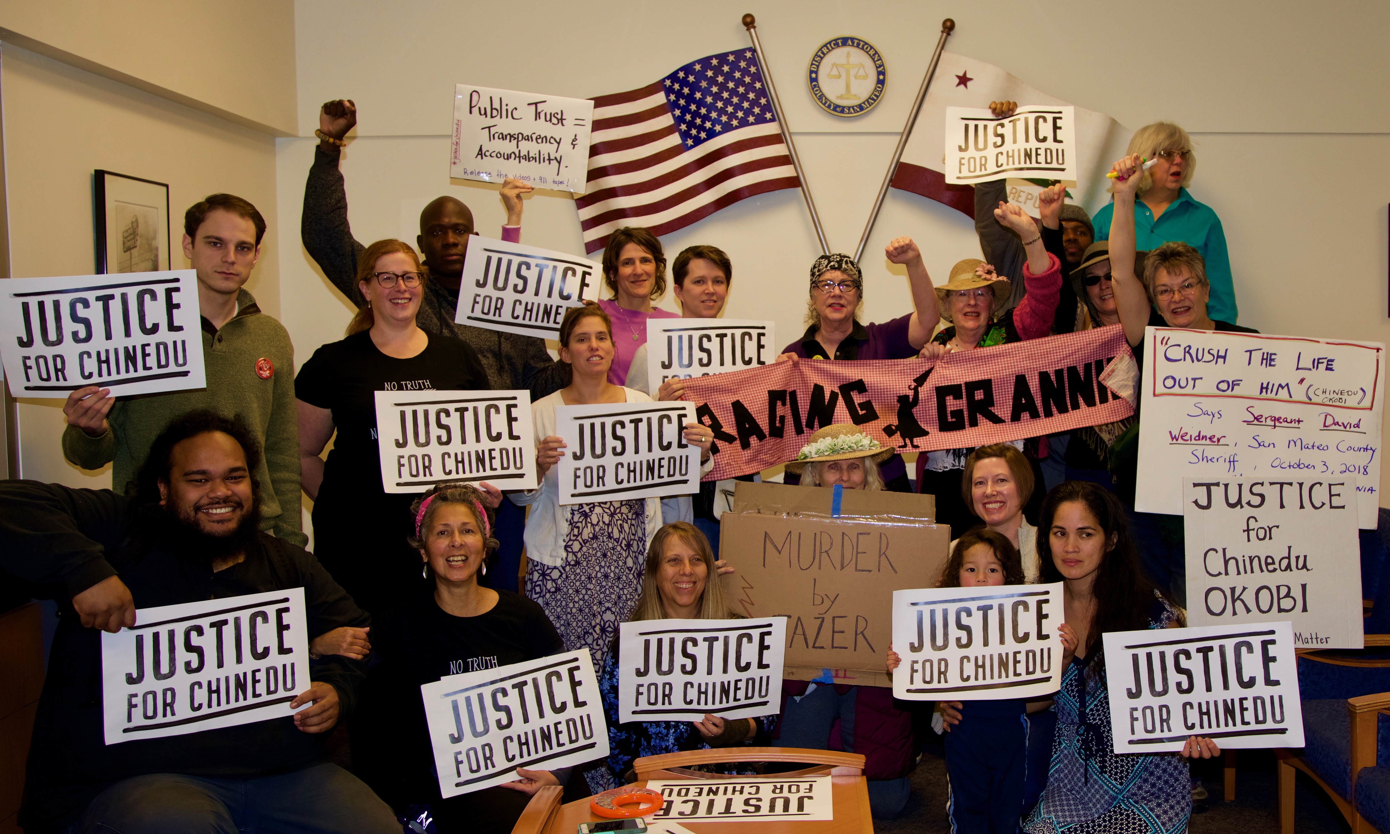Members of Justice4Chinedu, together with the Raging Grannies Action League, led the sit-in. Calling for an independent investigation, both groups said the public should be able to judge for themselves what happened that day. Okobi was walking on El Camino Real in Millbrae when a sheriff’s deputy approached him and without apparent cause called a Code 3 for more officers. Despite asking "what did I do" and pleading for help, Okobi was tased and went into cardiac arrest. There were no attempts to perform CPR and he was later pronounced dead at a nearby hospital.
