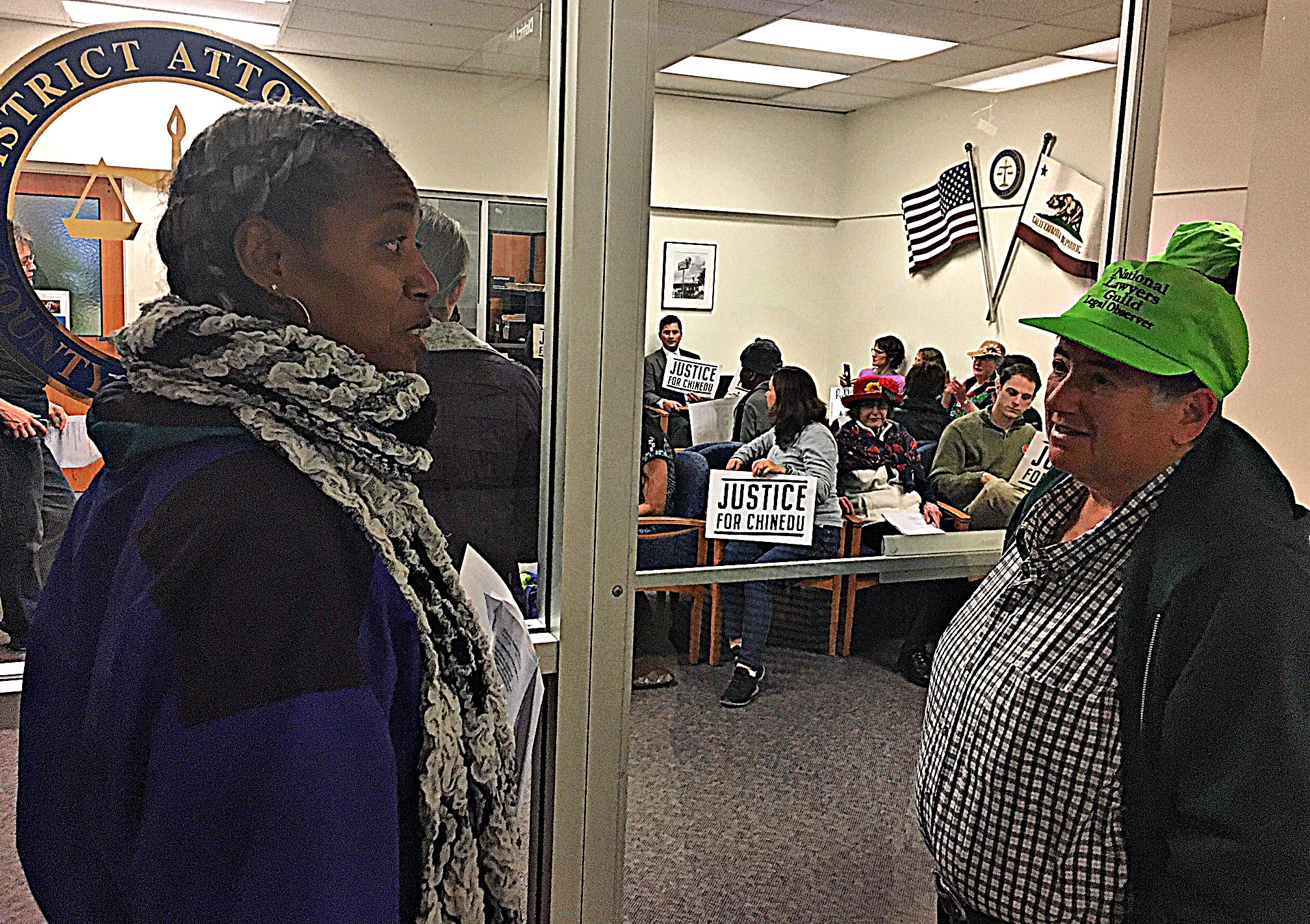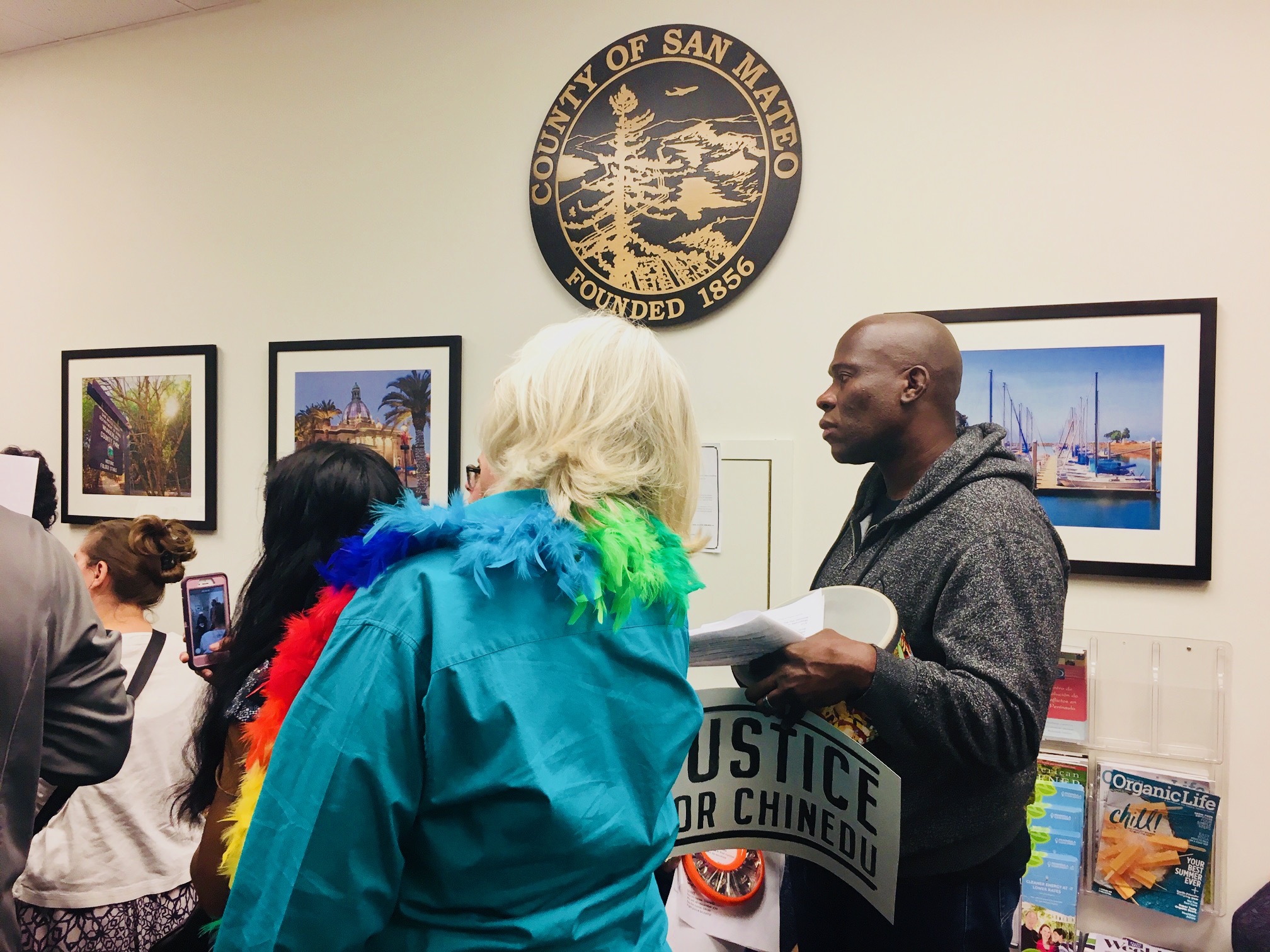 Chinedu Okobi was the third man to die last year in San Mateo County after being tased by law enforcement. More than 25 people sat in the lobby of the District Attorney's office on the morning of January 23 with signs and noisemakers. They swung by the Sheriff's office and then took their demands to the president of the Board of Supervisors the same day.