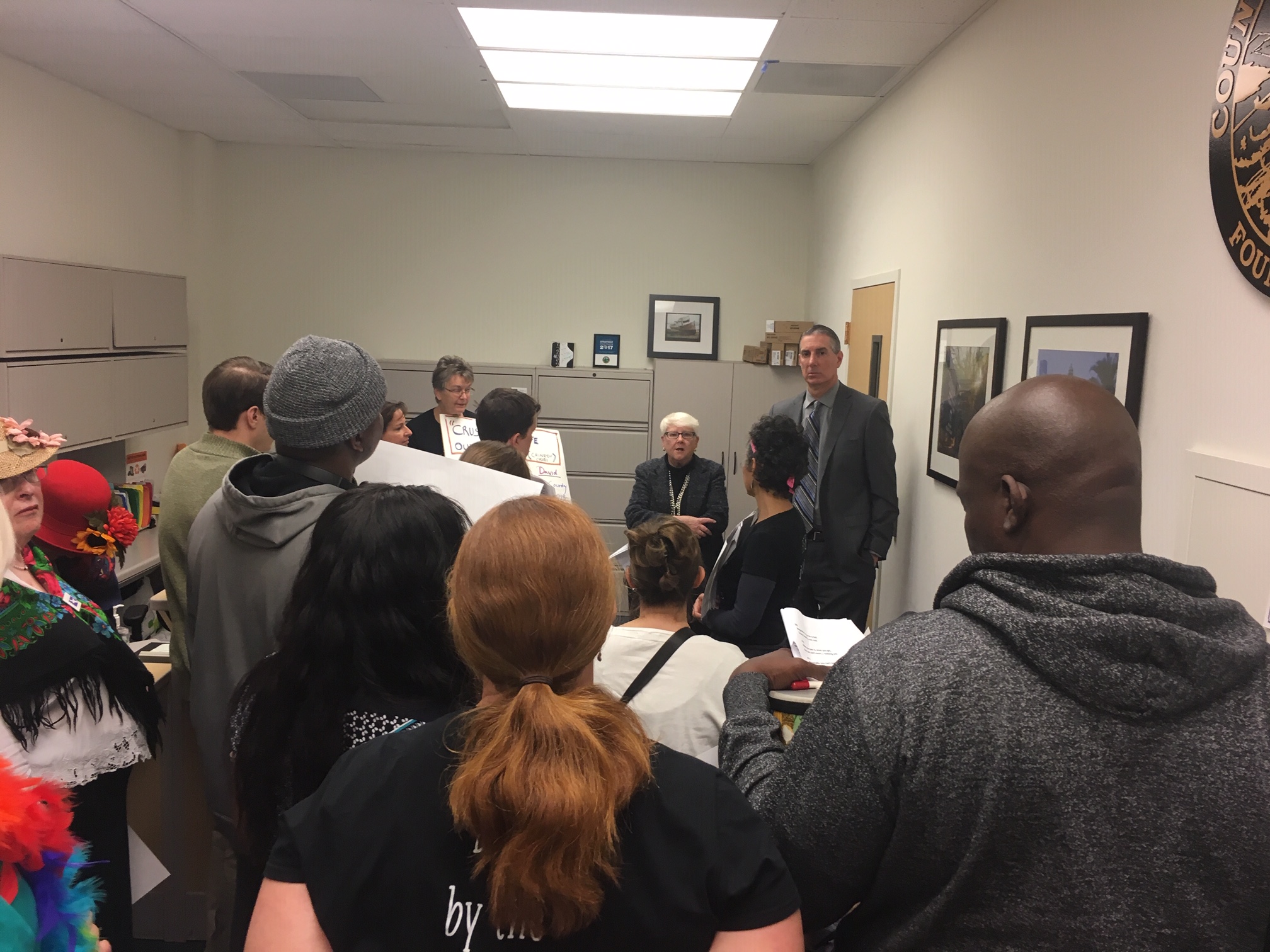 Top Photo: Board of Supervisors President Carole Groom, center, and County Manager, Mike Gallagy face demonstrators.