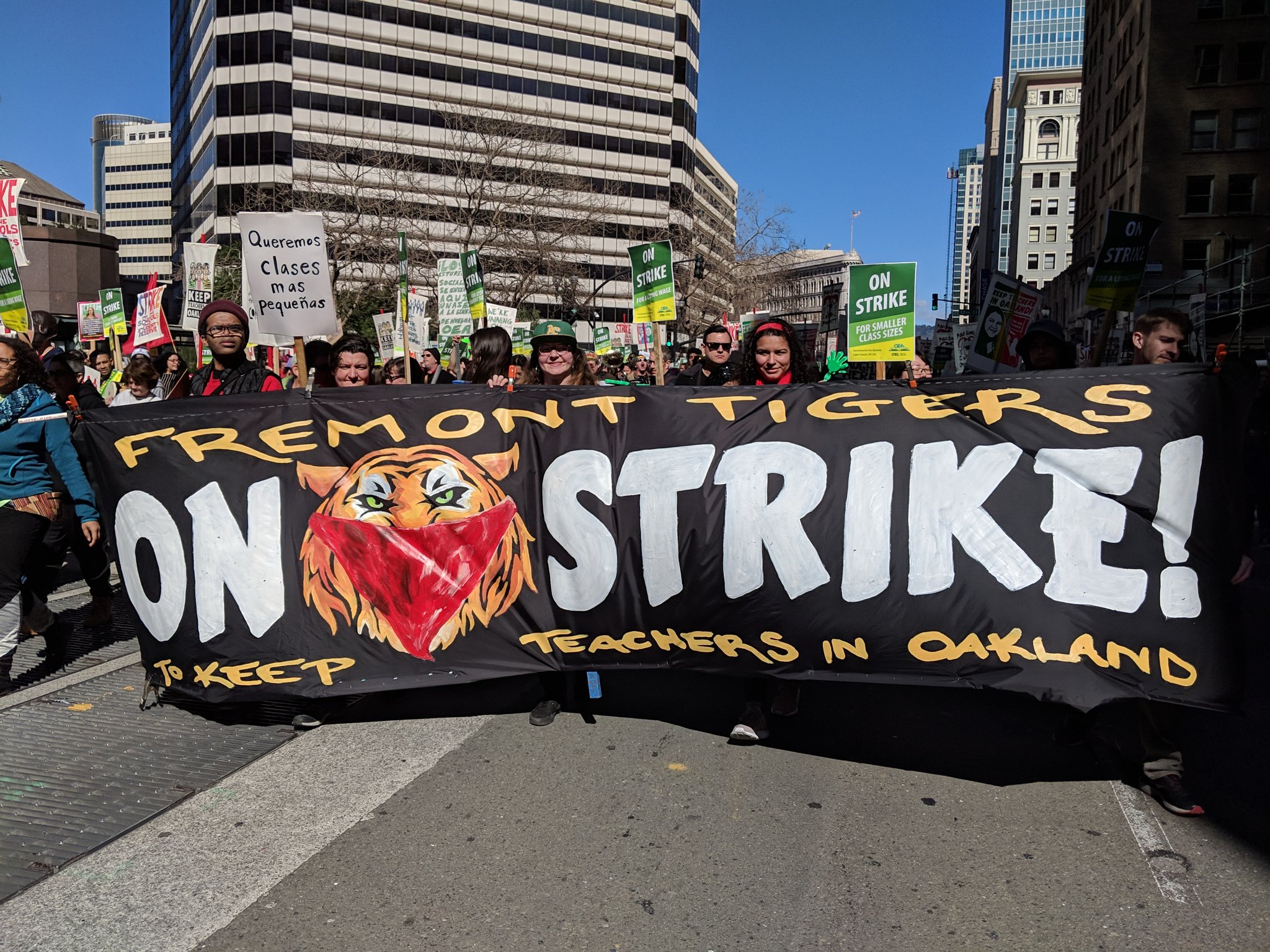 Thousands of teachers, students, and allies stood together in front of Oakland City Hall after picketing at schools across Oakland on the first morning of the teachers' strike. They then marched to OUSD headquarters to demand smaller class sizes, more student support, a moratorium on charters, no more school closures, and a living wage.