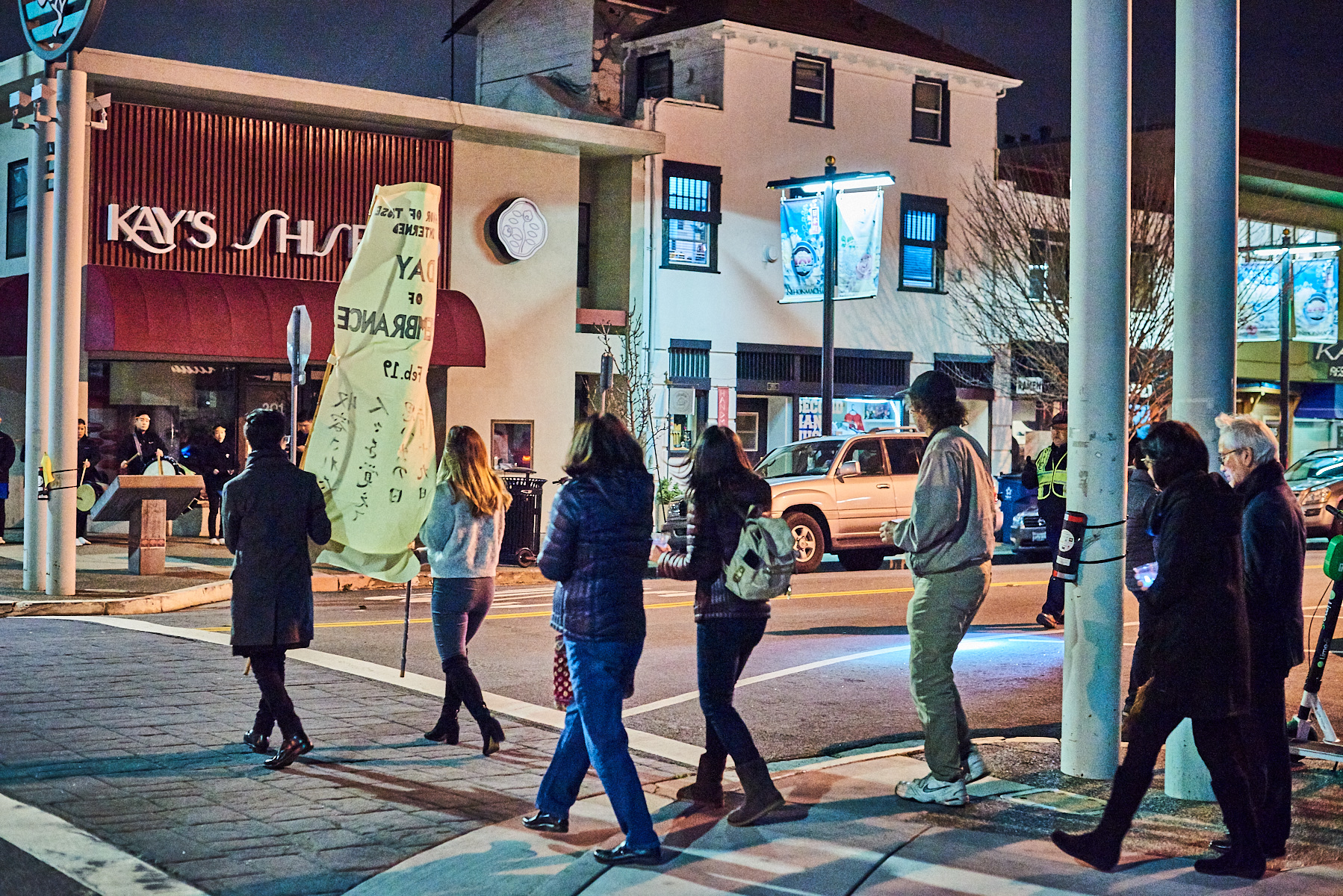 A candle-lighting ceremony, with one candle for each of the ten incarceration camps, preceded a march in the neighborhood adjacent the Buddhist temple, with its backdrop of historic buildings. San José Japantown is one of the last three Japantowns in the United States, the others being in San Francisco and Los Angeles. The Japantown in San José is the most authentic in that it wasn’t largely torn down and rebuilt. Many of the earliest buildings still remain; here photographer Chris Cassell captures marchers passing by some of those historic places.