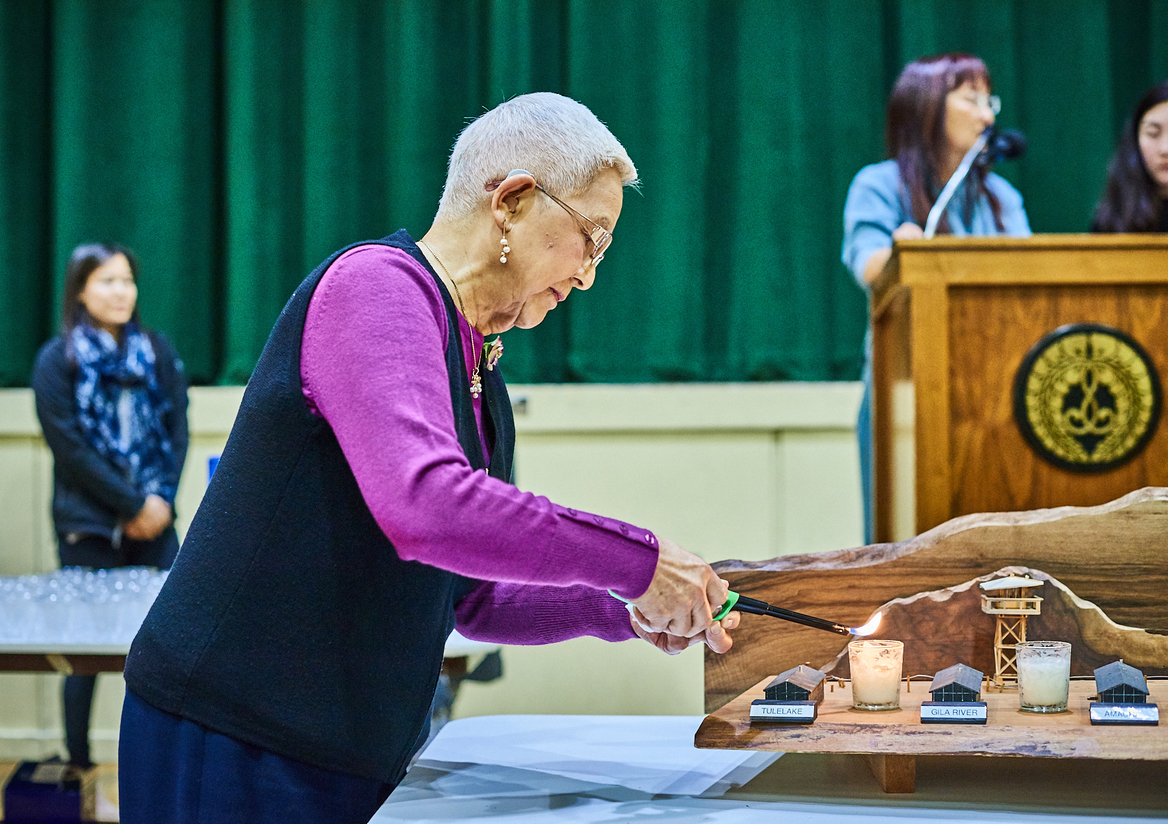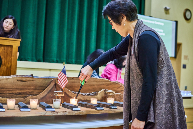 As a child, Chizu Omori was incarcerated in the Poston camp on the Colorado River Indian Reservation in Arizona during WWII. She shared her remembrance from a podium in the San José Buddhist Church Betsuin on the 77th anniversary of the signing of Executive Order 9066, commemorated by Japanese Americans with events on both U.S. coasts and even in the midwest.