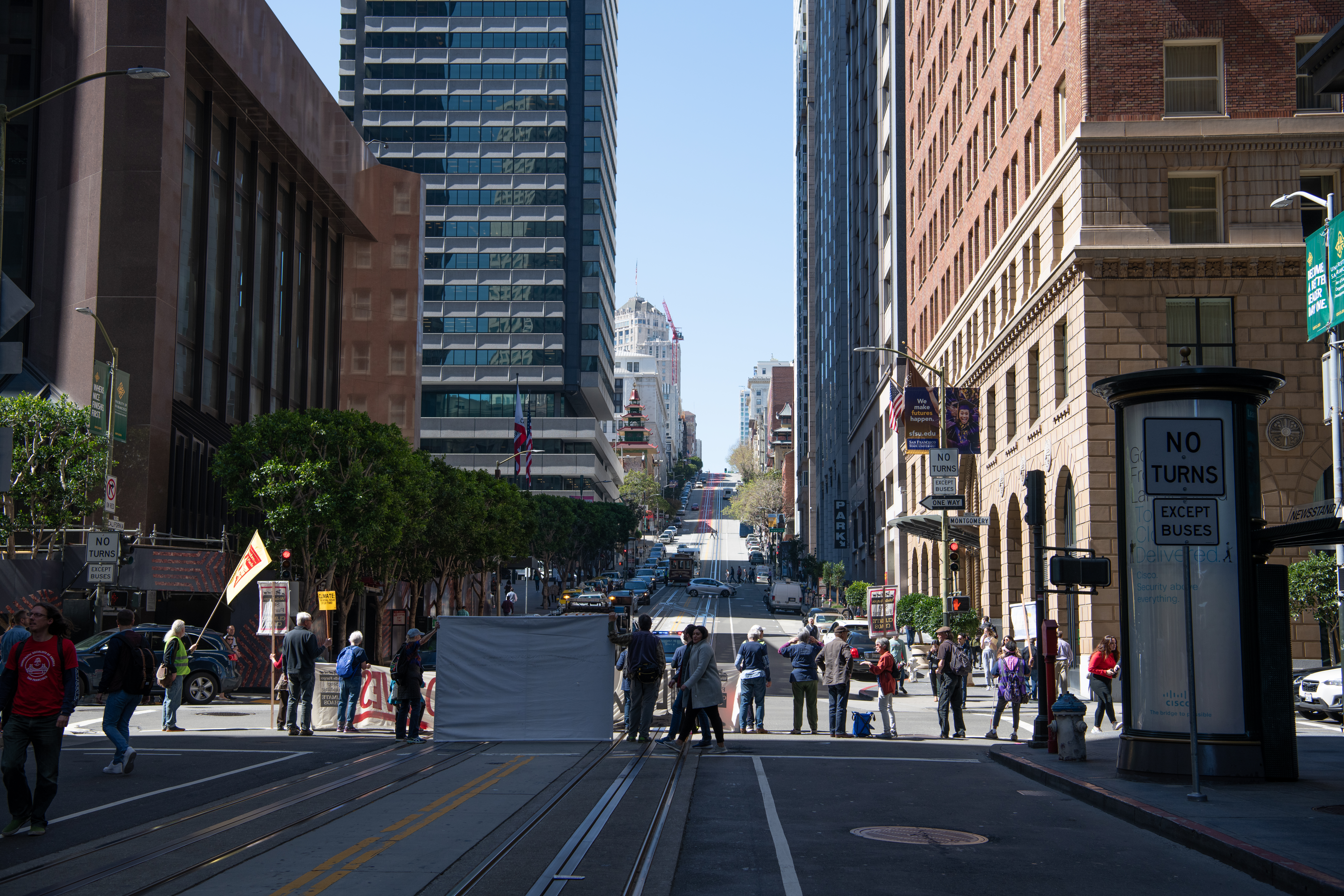 350 Silicon Valley, 1000 Grandmothers, and over forty environmental groups seize a section of California Street. Photos by Leon Kunstenaar