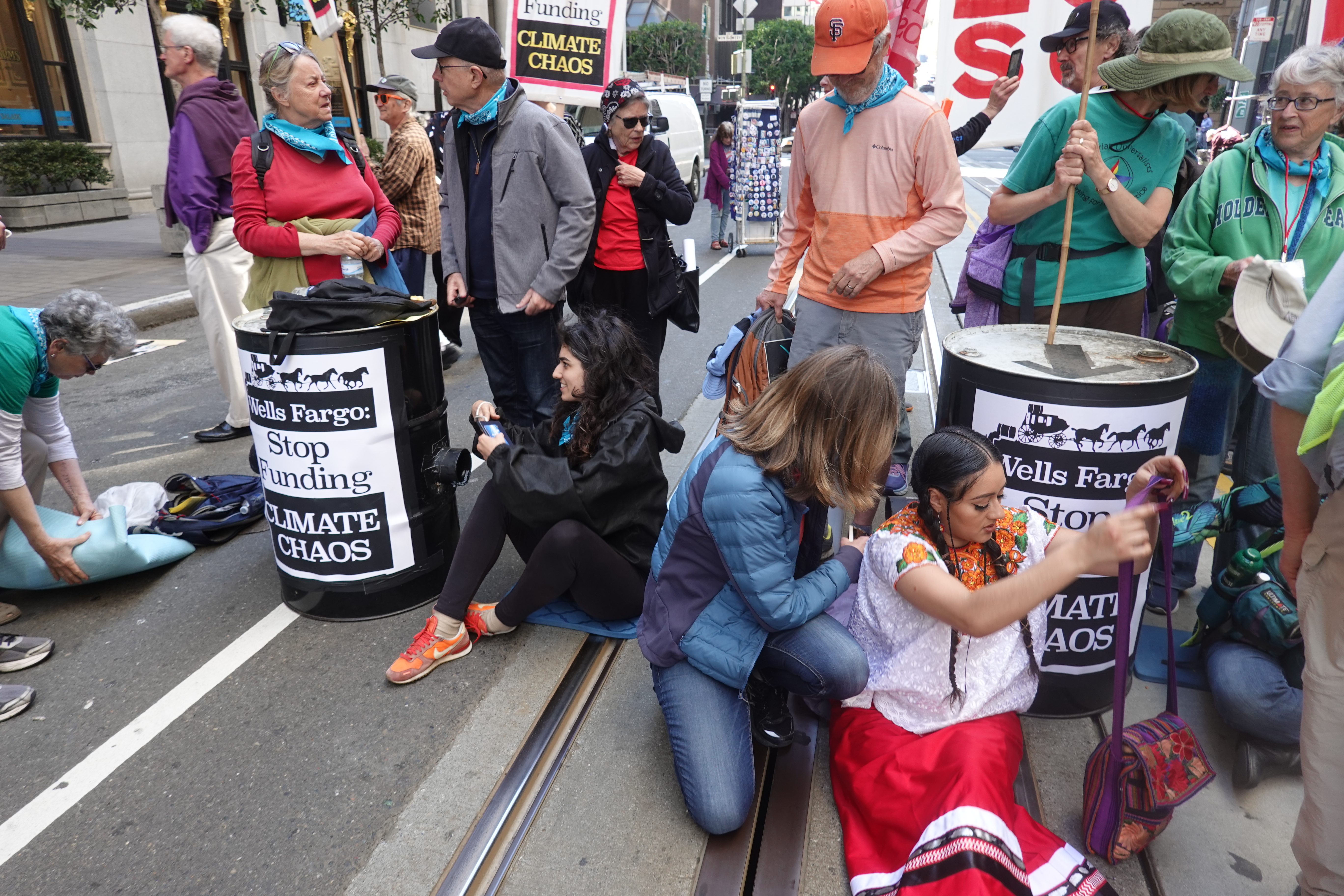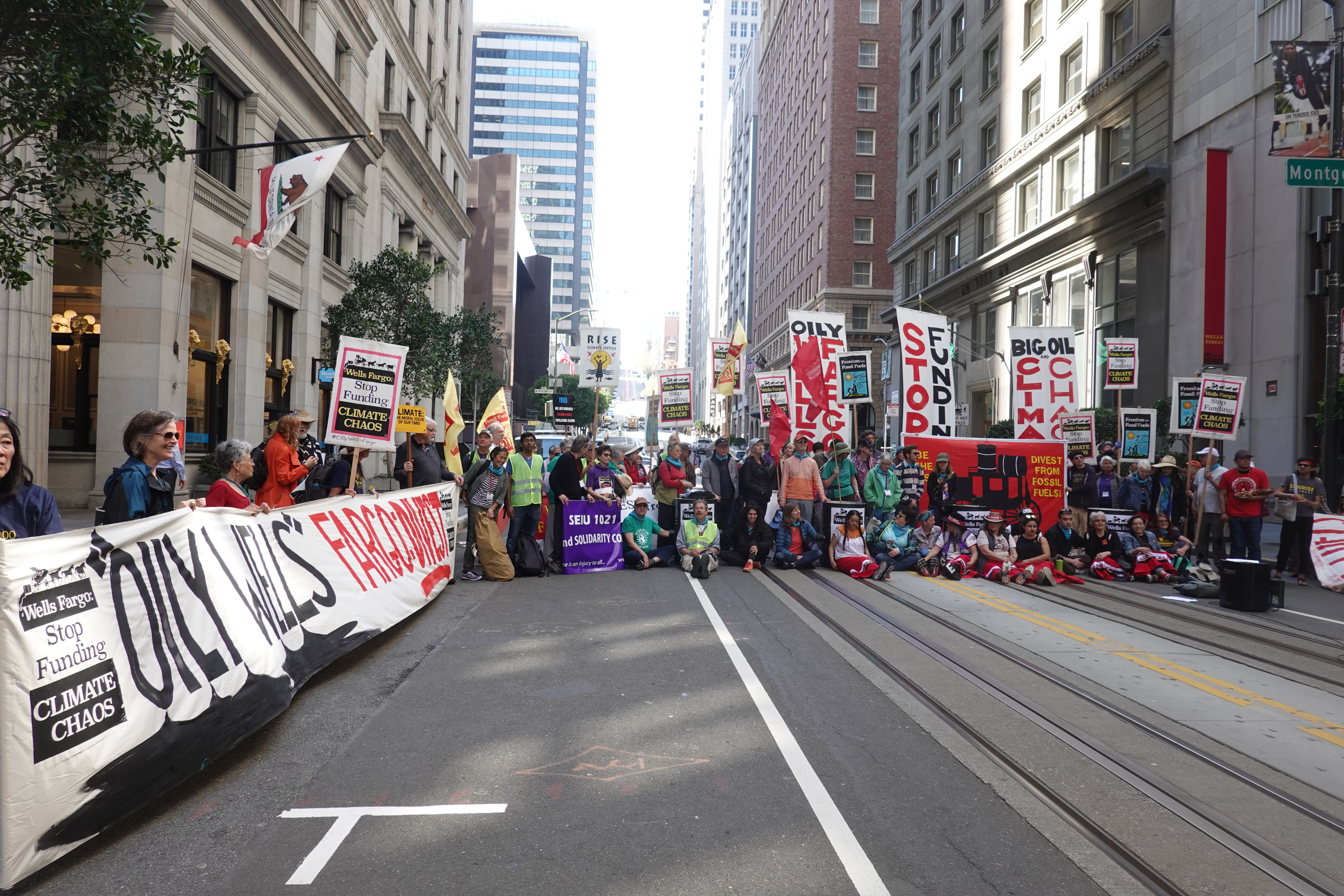 Wells Fargo is the leading lender to the fossil fuel industry. Protesters stopped auto traffic and cable cars for three hours to draw attention to demands that the 4th largest bank in the U.S. stop contributing to global warming.