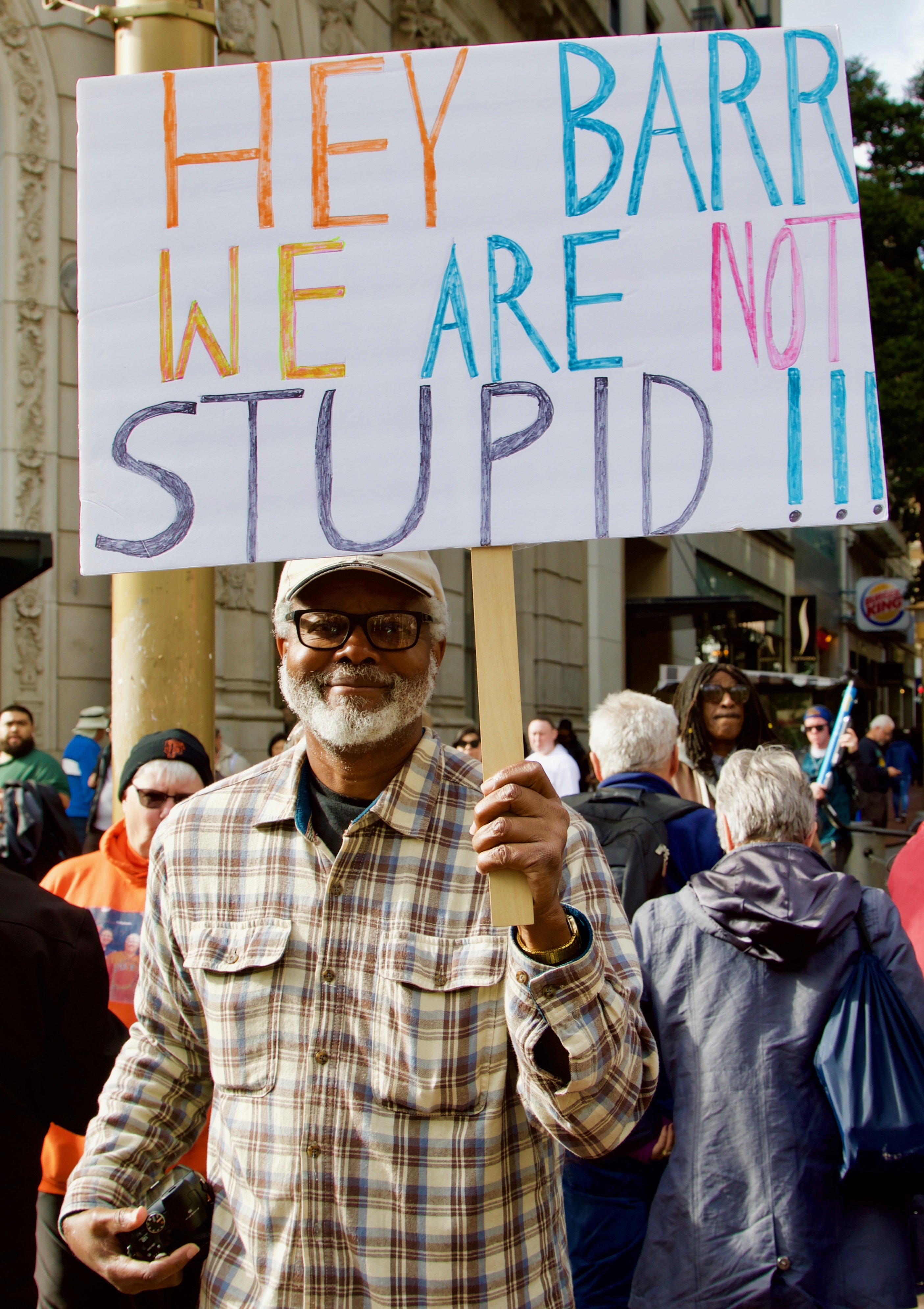 People carried signs saying, "Hey Barr, We Are Not Stupid," and insisting there be no cover-up. One sign read: "We can see there is obstruction and collusion--The Emperor Has No Clothes."