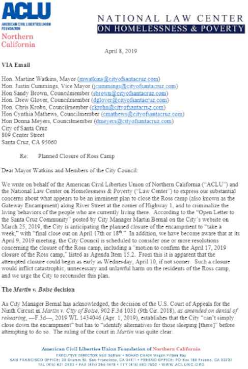 On April 8, the ACLU of Northern California and the National Law Center on Homelessness & Poverty sent a joint letter to the Santa Cruz City Council opposing the closure of the Ross homeless encampment. "[W]e are concerned about any plan to criminalize the living behaviors of residents of the Ross Camp, either directly or indirectly. Due to the lack of available shelter bed, Martin bars the City from carrying out such a plan," the letter states.