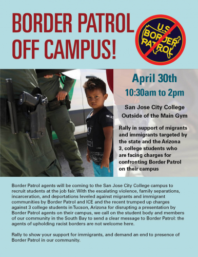 Border Patrol agents will be coming to the San Jose City College campus to recruit students at the job fair. With the escalating violence, family separations, incarceration, and deportations leveled against migrants and immigrant communities by Border Patrol and ICE and the recent trumped up charges against 3 college students in Tucson, Arizona for disrupting a presentation by Border Patrol agents on their campus, we call on the student body and members of our community in the South Bay to send a clear message to Border Patrol: the agents of upholding racist borders are not welcome here.