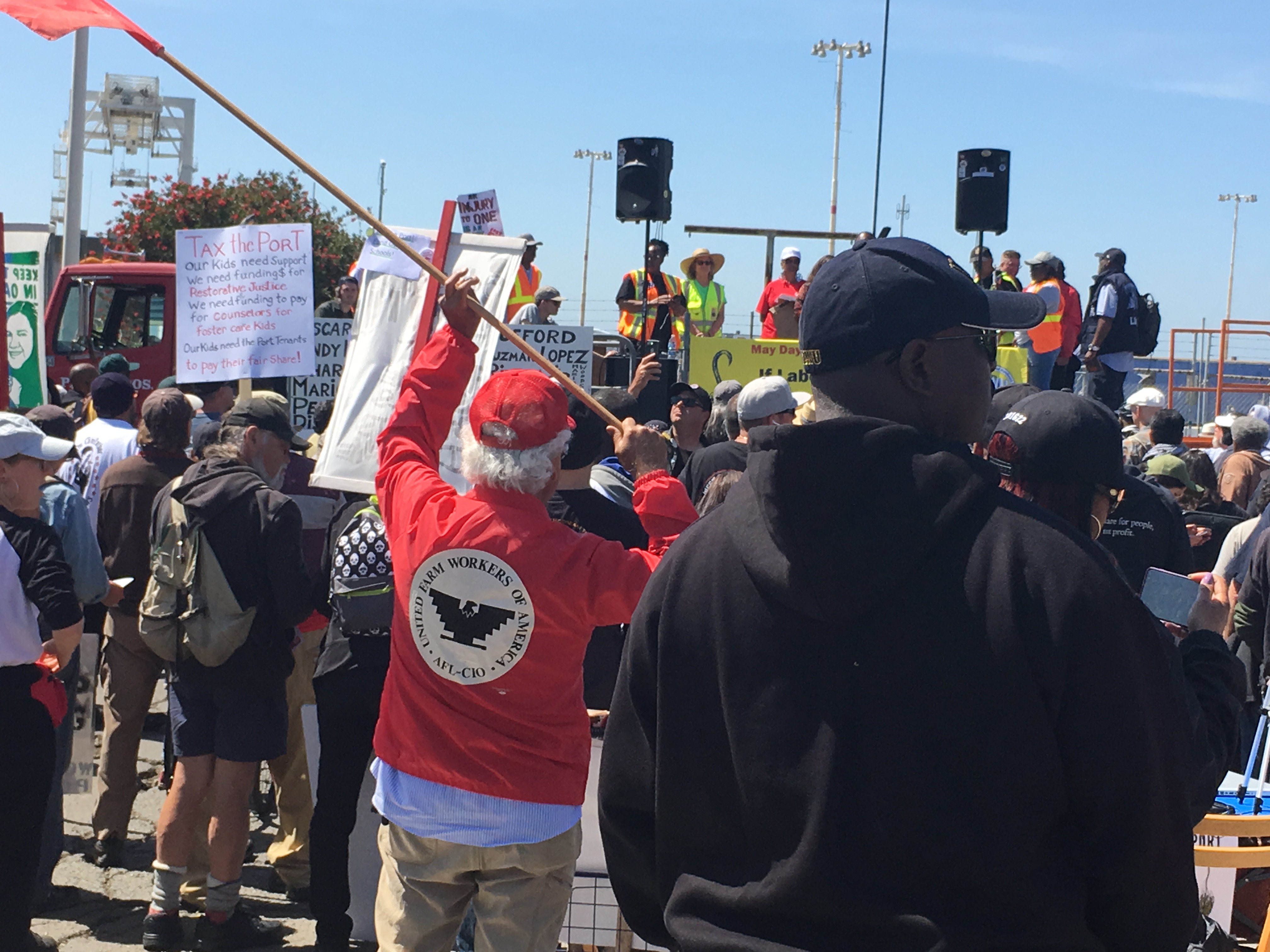 May Day protest at the Port of Oakland Howard terminal where A's billionaire owner John Fisher wants to build a new A's stadium and 4,000 $1 million dollar condos. The rally was initiated by ILWU Local 10