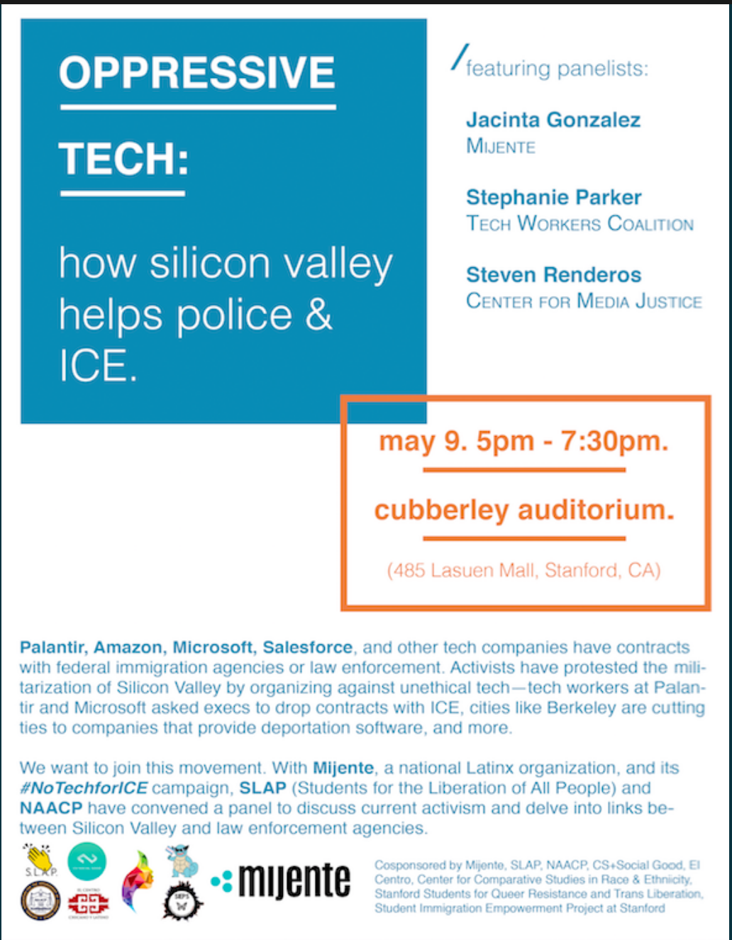 We want to join this movement. With Mijente, a national Latinx organization, and its #NoTechforICE campaign, SLAP (Students for the Liberation of All People) and NAACP have convened a panel to discuss current activism and delve into links between Silicon Valley and law enforcement agencies.