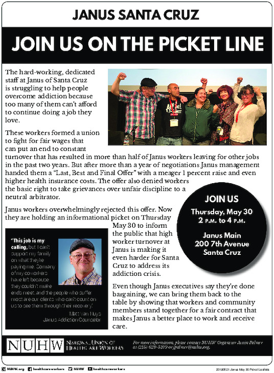 Janus workers are grateful for your support, and they need your help to win a fair contract that can improve patient care and help them make ends meet doing work that helps so many people in need. Please join them Thursday, May 30 from 2 p.m. to 4 p.m. for an informational picket outside of Janus Main, 200 7th Ave., Santa Cruz!