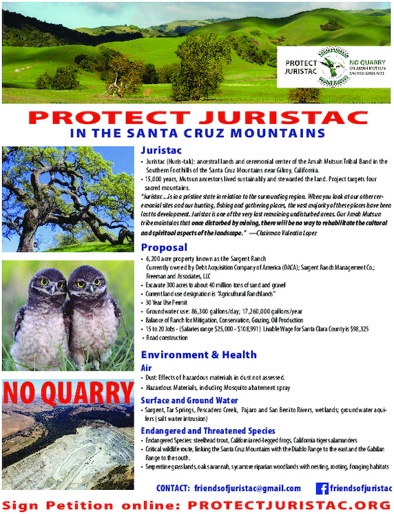 Join us for an relatively-informal outreach meeting to learn about the grassroots effort to prevent Juristac (the most sacred ceremonial site of the Amah Mutsun 'Ohlone' People) from being turned into a massive sand and gravel quarry!