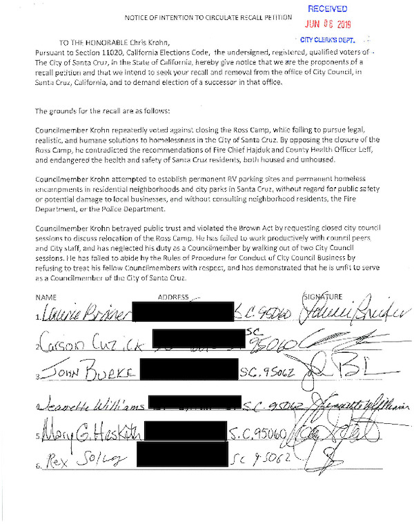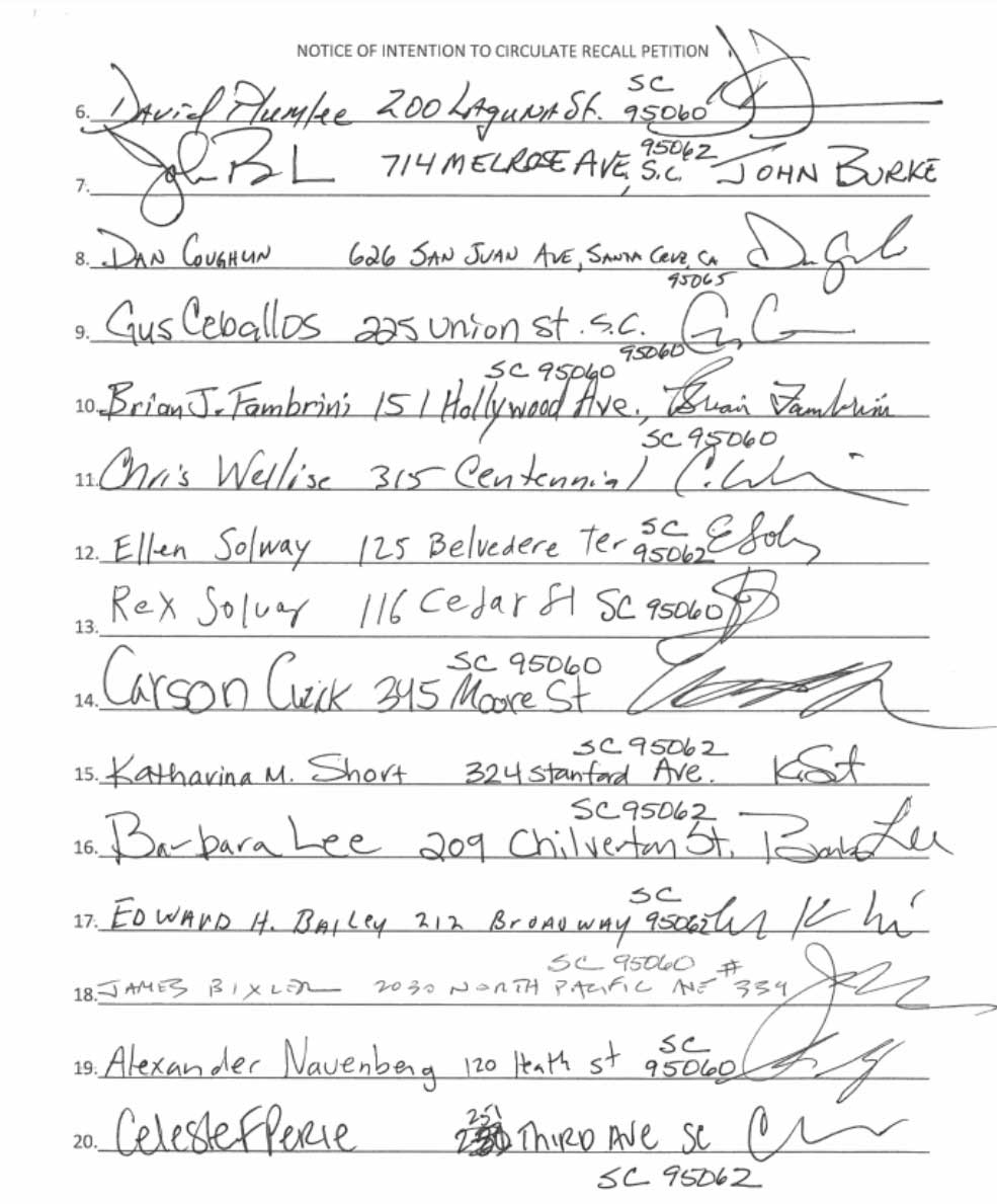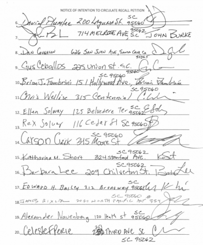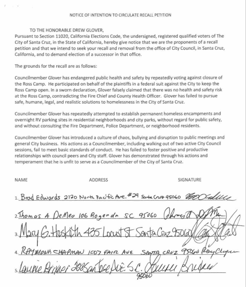 Union Foodie Truck owner Rachel Thompson and her husband Gus Ceballos issued a letter in support of the recall, which is being circulated by Santa Cruz Together on social media. Ceballos, who is Program Director for the local non-profit Companion for Life Project and a losing candidate in 2010 for Santa Cruz City Council, is one of the 20 individuals who signed the original notices of intention to circulate the recall petitions submitted to the city. The notice of intention aimed at Drew Glover, that Ceballos signed, contained false information about Glover (see photo).