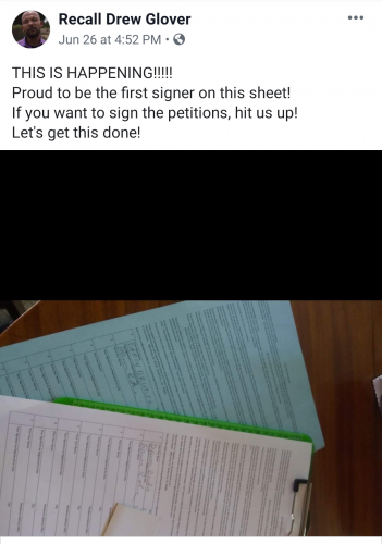 Ashley Scontriano has been calling for Drew Glover to be recalled since March or earlier (see photo). During the 2018 election, Scontriano expressed extreme views on homelessness and white supremacy.