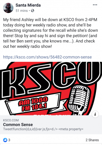 AM radio station KSCO hosts weekly petition signing events at their station during the show hosted by self-described "radical republican" and on-air personality Ashley Scontriano, who was a candidate in the 2018 Santa Cruz City Council election who lost the race to Drew Glover by a considerable margin.