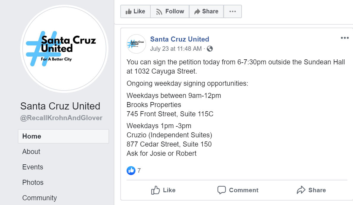 Individuals working on the recall post signature gathering locations directly to Santa Mierda's Facebook page regularly, including Dan Coughlin, Carol Polhamus, Paige Concannon, Ashley Scontriano, and Take Back Santa Cruz member Kim Laney.