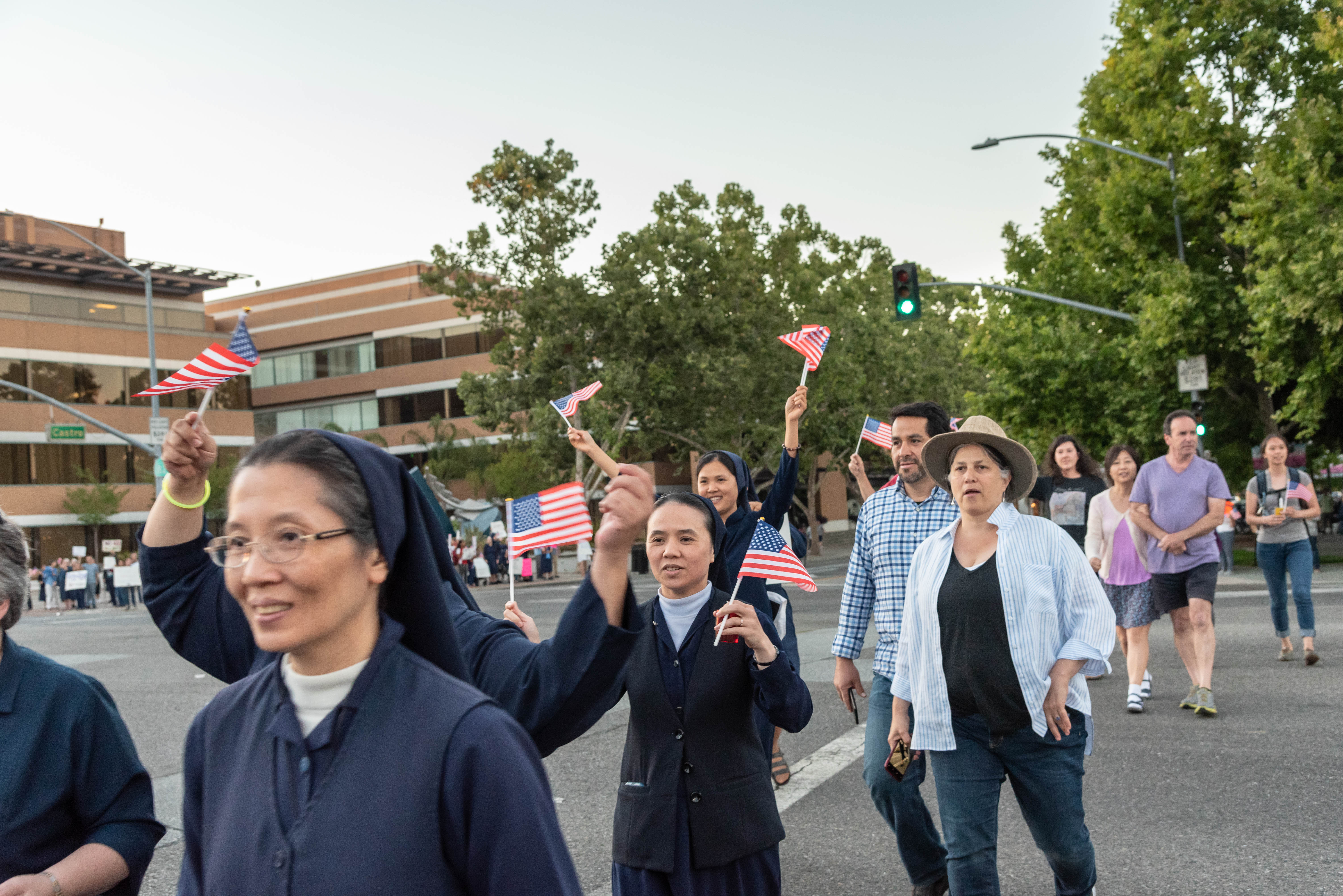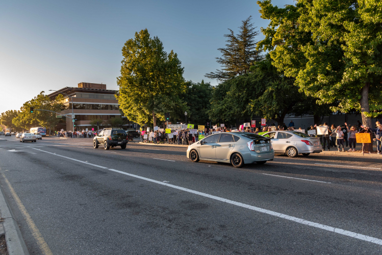 Starting at the intersection of El Camino Real and Castro Street at 7:30 p.m., people lined the sidewalks of the busy intersection. They planned to end their demonstration with a candlelight vigil featuring a mass reading of the lines of poetry inscribed on the base of the Statue of Liberty from 8:45-9 p.m., but protesters eager to be seen by passing traffic continued to rally long after the scheduled close.