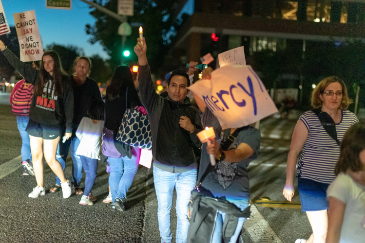 On a warm Friday night, residents of Mountain View and nearby towns took part in a Lights for Liberty vigil, as part of worldwide protests against detention camps at the U.S.-Mexico border. Just as they did almost exactly one year earlier, demonstrators waved signs calling out the Trump administration for inhumane conditions in detention camps, mass deportation and deaths at the border.
