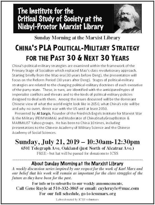 Presented by Al Sargis, Founder of the Friedrich Engels Institute for Marxist War & the Military (FEIMWAMA) and Moderator of ChinaStudyGroupBoston & MARMILIST Yahoo groups. He has been to China 10 times, including presentations to the Chinese Academy of Military Science and the Chinese Academy of Social Sciences.