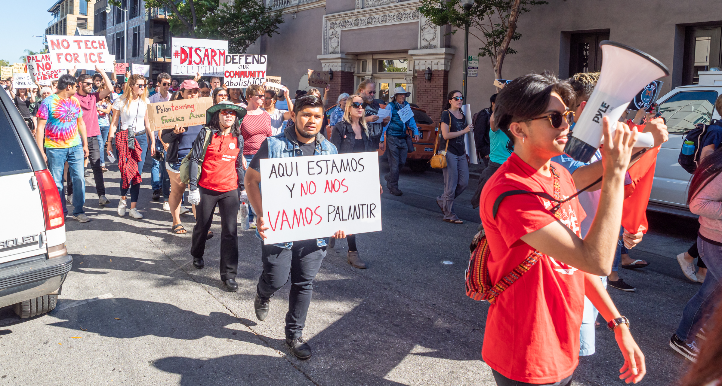 Demonstrators marched through blocks of Palo Alto's downtown area, bringing traffic to a halt in key locations. They rallied at Palantir's front door, blocking the main entrance/exit. Filling Alma Street, a major city of Palo Alto artery, they chanted their demands, calling on the data mining company to stop contributing to immigrant targeting. Palantir helped create the the U.S. Custom and Border Protection’s “Analytical Framework for Intelligence” and other tools. ICE utilizes Palantir’s software to map a target's family relationships, get their Social Security number, address, phone number, height, weight, eye color, and driver's license number.