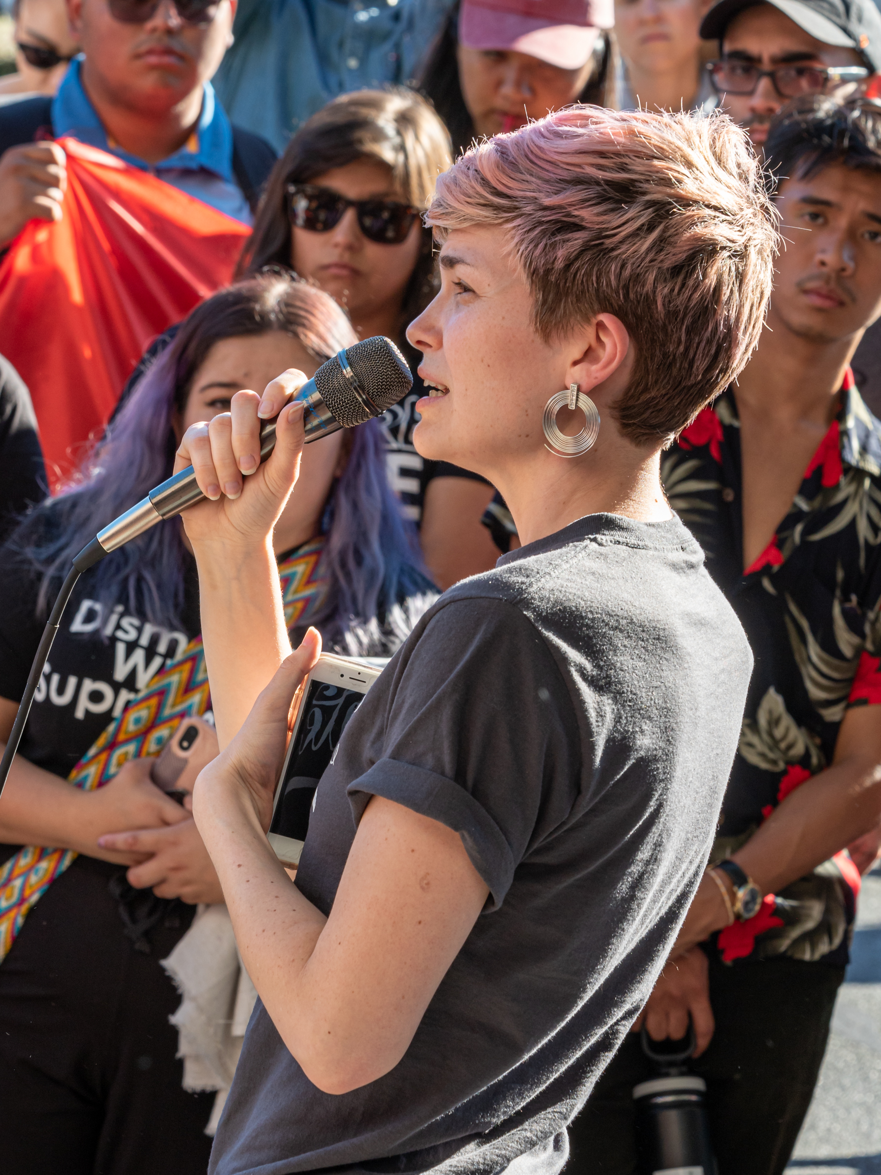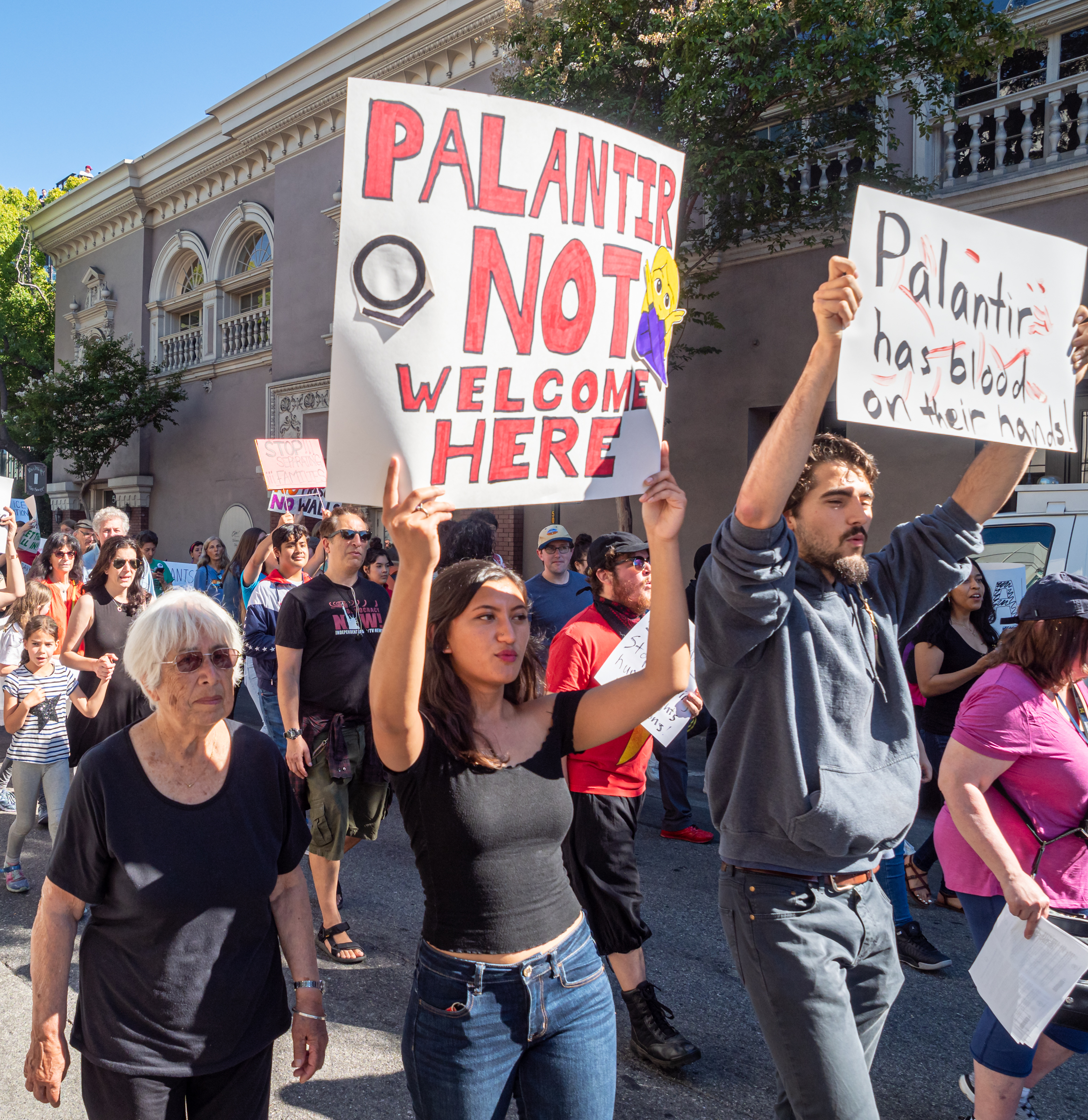 July 12 was a national day of action to call for the protection of immigrants from ICE raids. In Palo Alto, demonstrators marched on Palantir Technologies' headquarters, saying the data mining company is helping the Trump administration separate families. Palantir sells software that assists the government in tracking and finding people to arrest and deport.