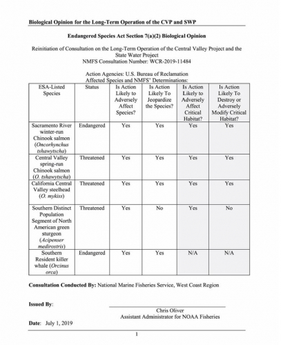Regina Chichizola of Save California's Salmon, referring to the front page of the leaked Endangered Species Report for the Trump water plan, said, "There is no analysis of the impacts to the Trinity and Klamath fisheries beyond measures to make sure the diversion into Clear Creek and Whiskeytown get more water. Because fall chinook are not listed, they take the biggest hit (as do the Tribes and fishing industry). This is reflected in the orca impacts."