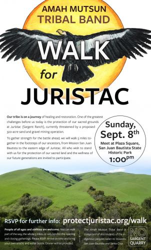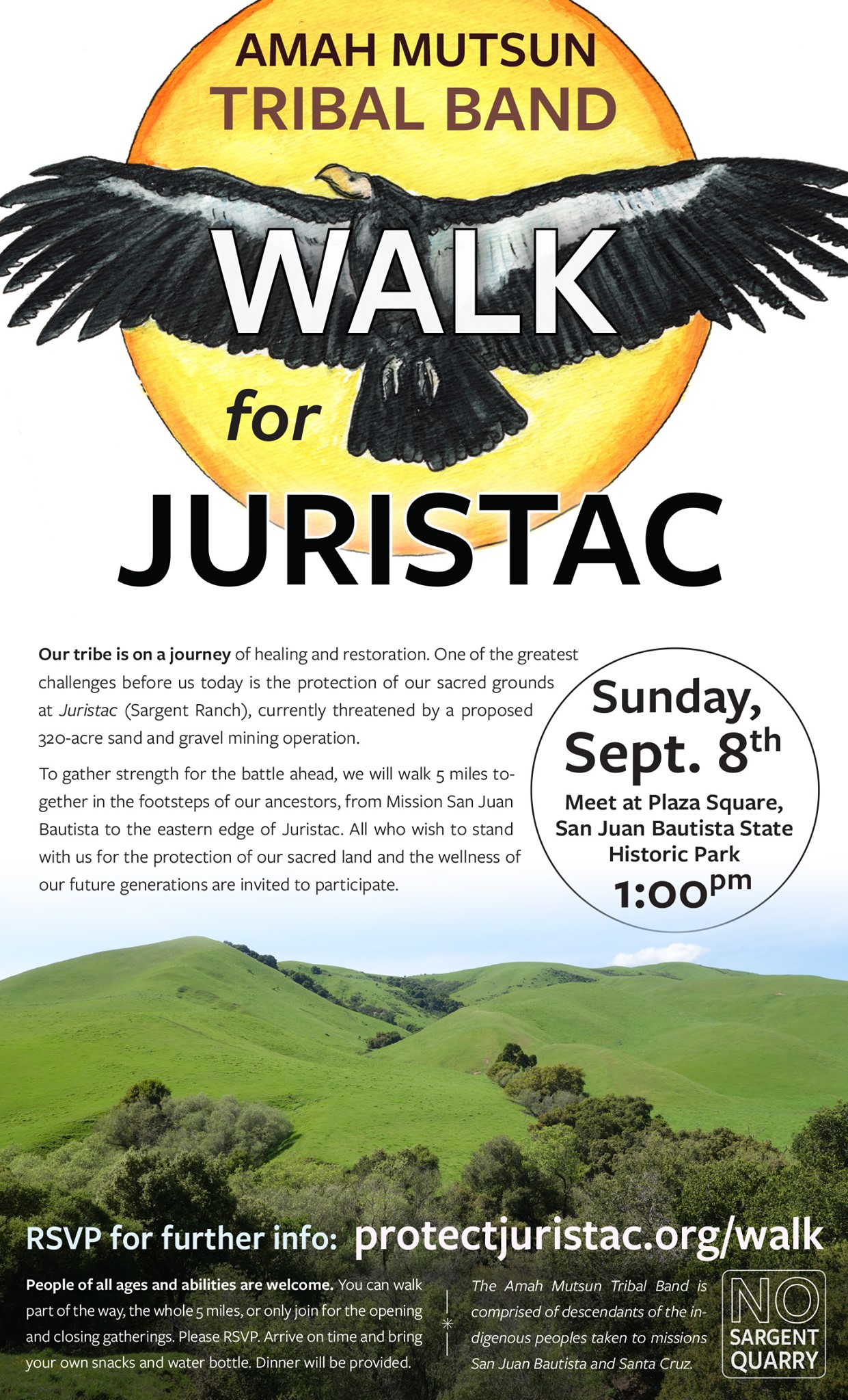 WALK WITH US— Our tribe is on a journey of healing and restoration. One of the greatest challenges before us today is the protection of our sacred grounds at Juristac (Sargent Ranch), currently threatened by a proposed 320-acre sand and gravel mining operation.