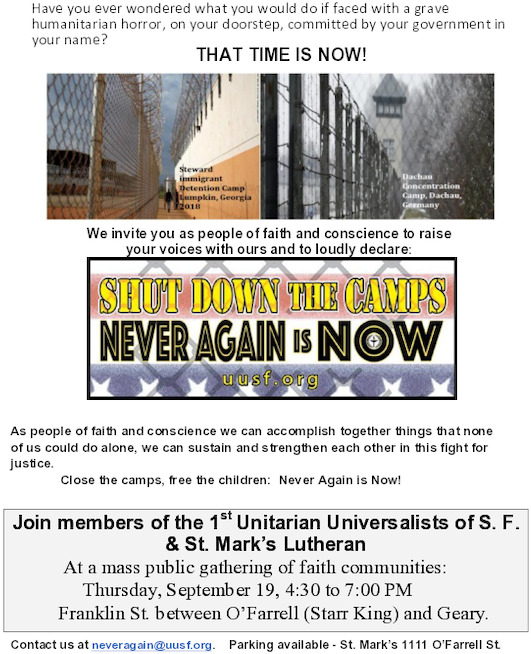 We at the First Unitarian Universalist Society are reaching out to friends and activists who are interested in calling attention to the devastating and dehumanizing actions being carried out on our southern border towards persons seeking asylum which is their legal right. Since July 31, we have been witnessing on this issue after our Sunday Service, at 12:30 pm. We now are calling for others to join us in a much larger public event on Thursday, September 19, from 4:30 to 7:00 pm, right outside out church at: 1187 Franklin Street, corner Geary Blvd.
