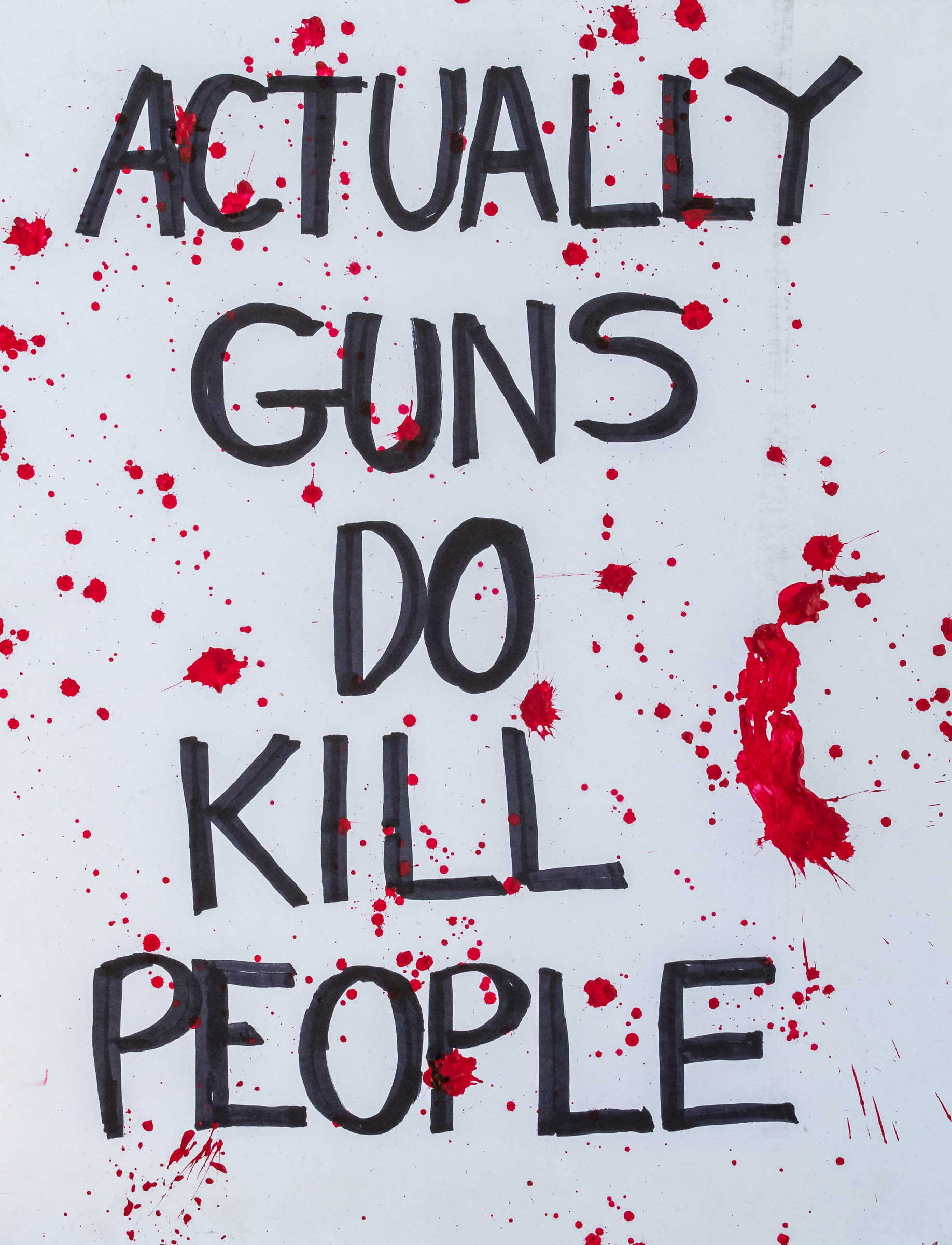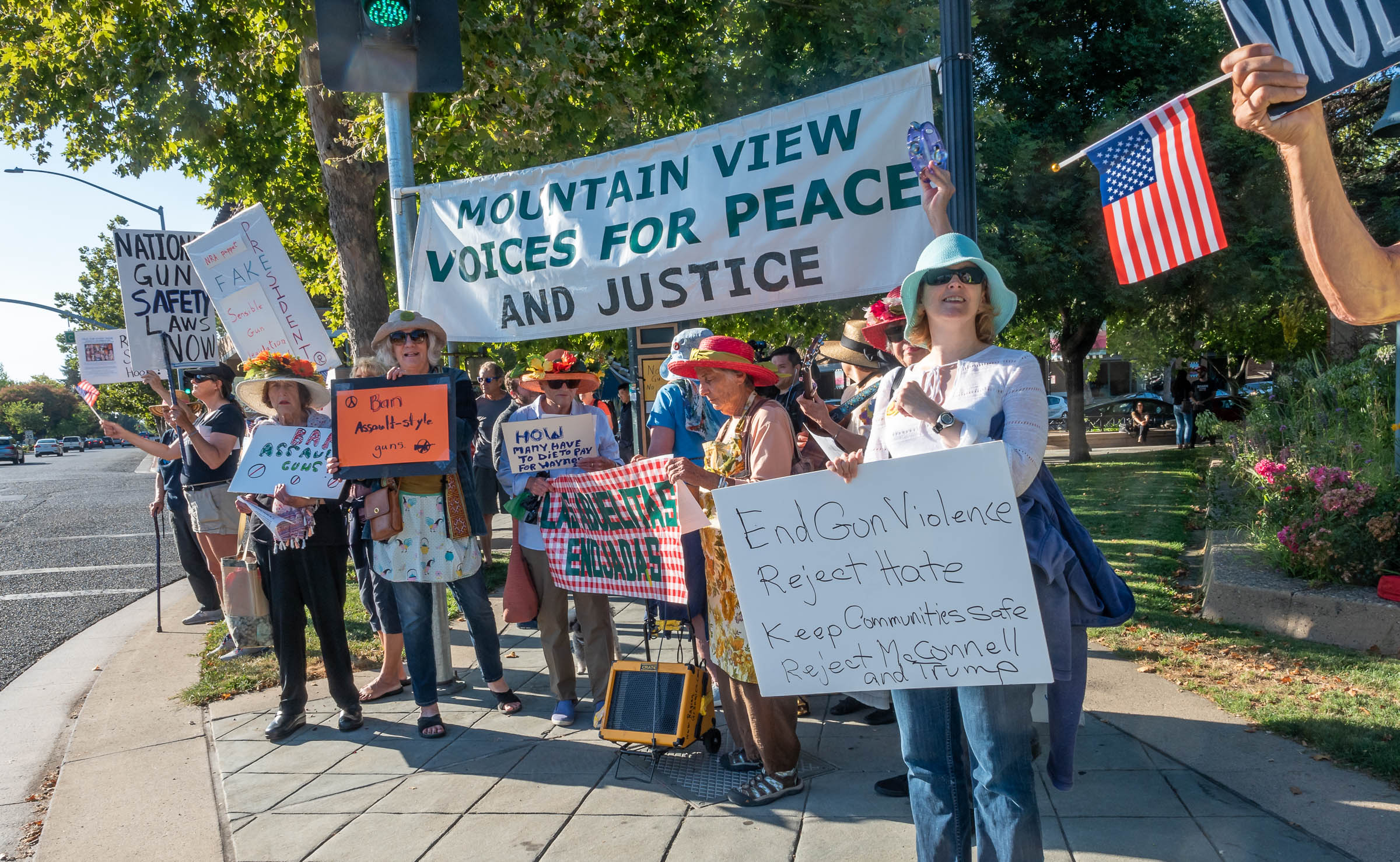 On Monday, August 19, 2019 at the intersection of El Camino Real and Castro Street in Mountain View, California, protesters waved signs including one demanding that Senate Majority Leader Mitch McConnell act to prevent shooting massacres. They said that although nearly 40,000 Americans die every year from gun violence, our politicians--especially those bought out by the NRA--have refused to address the issue other than with their thoughts and prayers.
