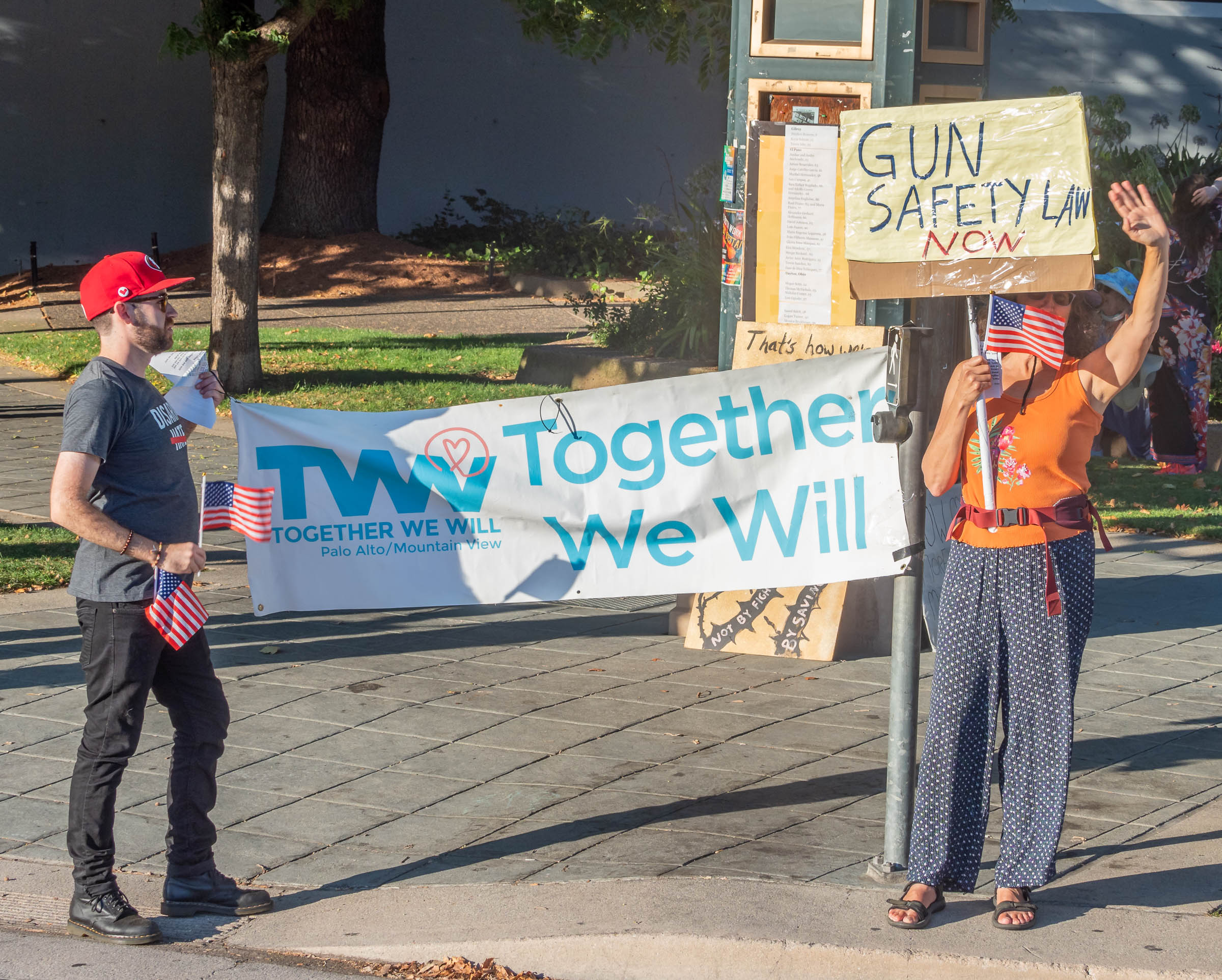 There were many honks of approval from passing cars. After demonstrating at the busy intersection they held a "reading of the names" of some of the victims of gun violence. The event was sponsored by Together We Will--Palo Alto/Mtn. View.