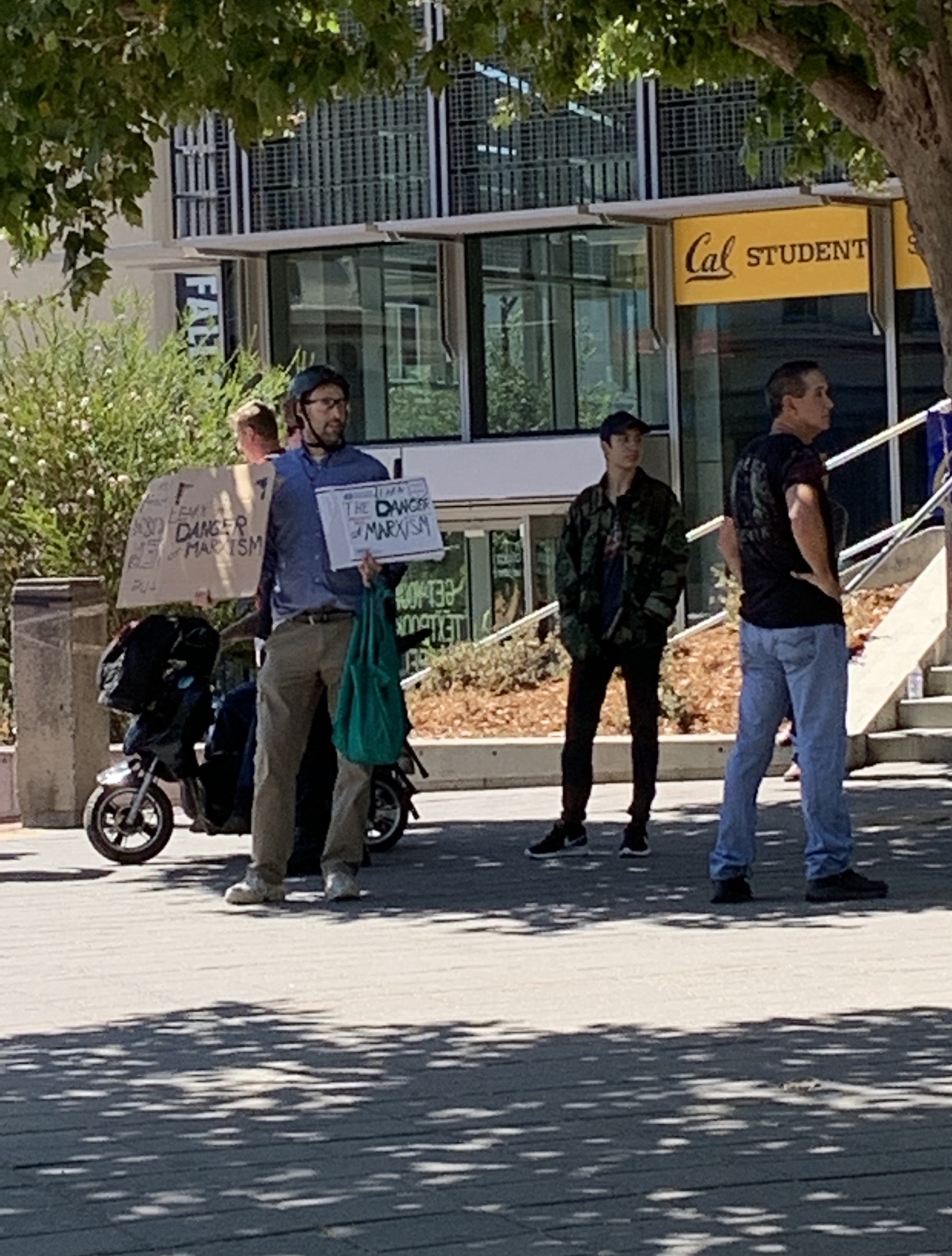 The far-right slowly trickled in to the meeting point at Sproul Plaza wearing their fear on their sleeves. Right wing organizers instructed participants to avoid wearing “MAGA” (Make America Great Again) hats and other clothing indicating support for Donald Trump in order to avoid accountability from the local community. Despite their claim to be victims of a violent and terroristic communist conspiracy that controls every aspect of their lives, these far-right wingnuts were heavily protected by the liberal city and university managers who have continually facilitated fascist aggressions via unprecedented levels of resources and police power.