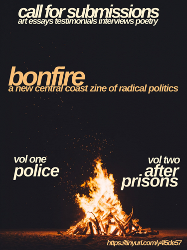 The first volume of bonfire will be published as a double issue, focusing both on policing today and imagining a life after prisons. We seek contributions that deal with these two themes in the form of essay, personal testimony, interviews, poetry, visual art, and research papers.