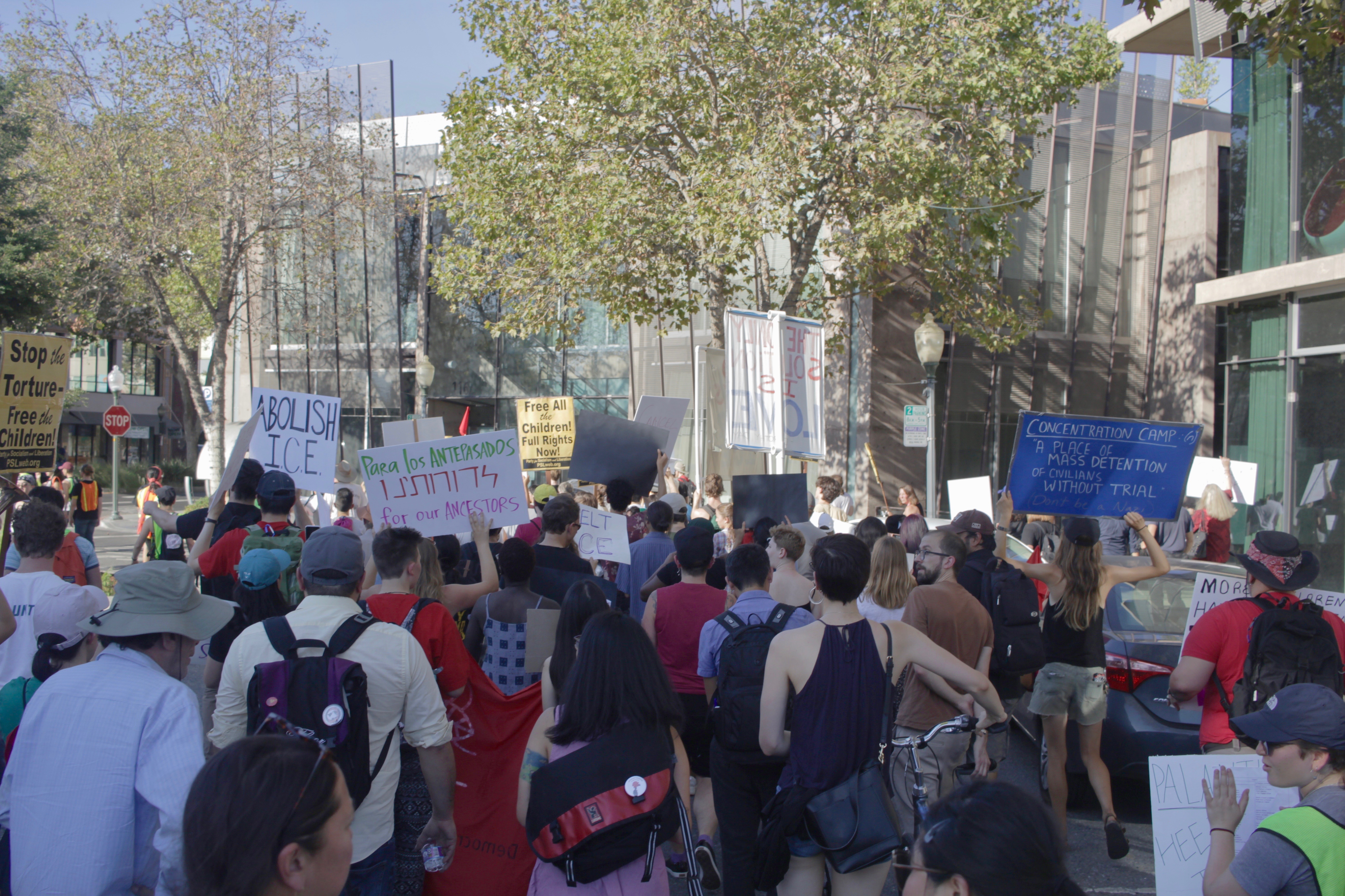 The Coalition to Close the Concentration Camps--Bay Area spearheaded a protest at Palantir's worldwide headquarters in downtown Palo Alto as part of a bicoastal day of action last week.