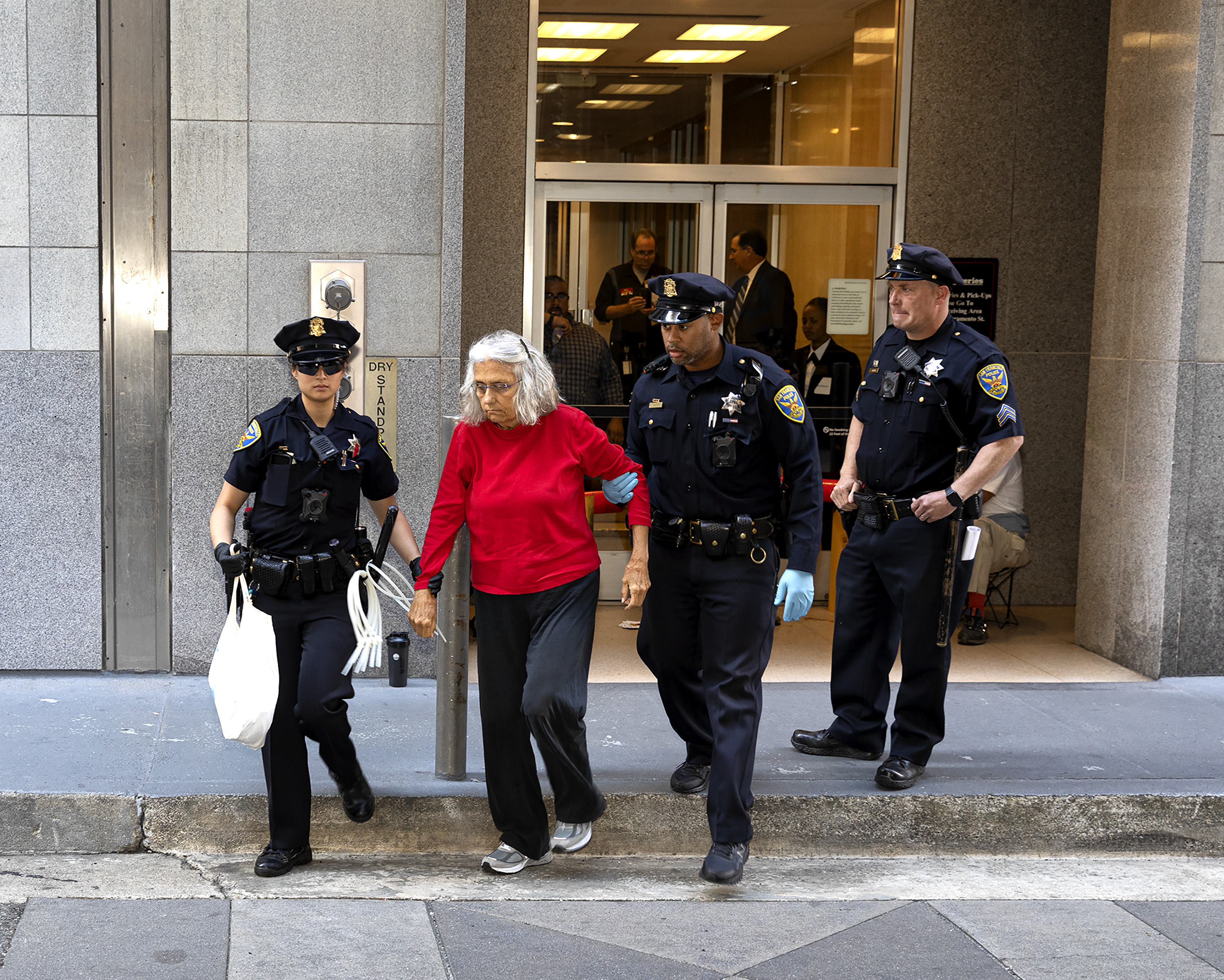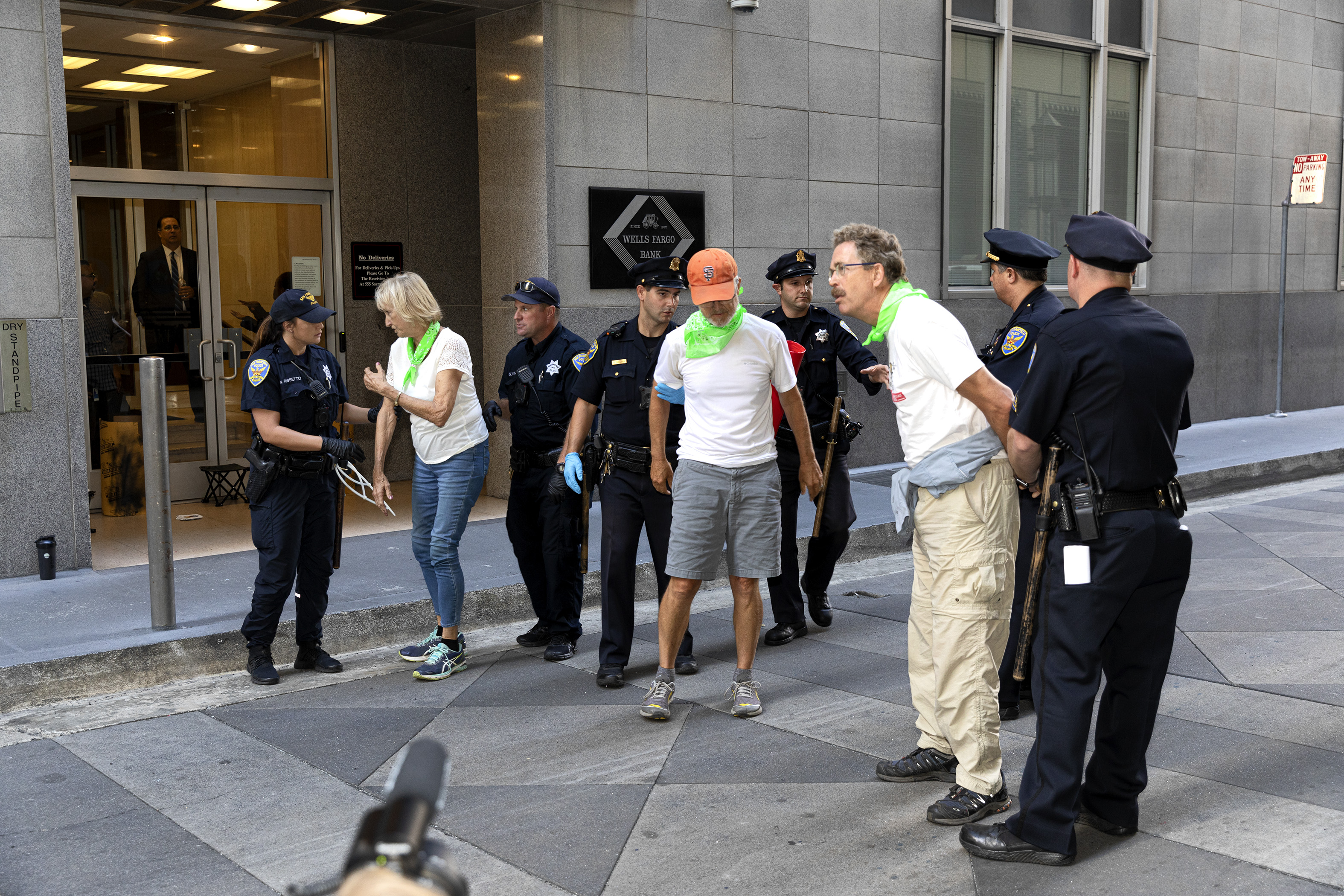 The demonstrators, many of whom were retirees, said they were motivated by youth-led Climate Strike Actions over the past week. One group, Silicon Valley 350, organized a similar direct action earlier this year in March, targeting the nation's fourth largest bank for protest, Wells Fargo, just in time to crash its annual founding day celebration. On that occasion there were no arrests.