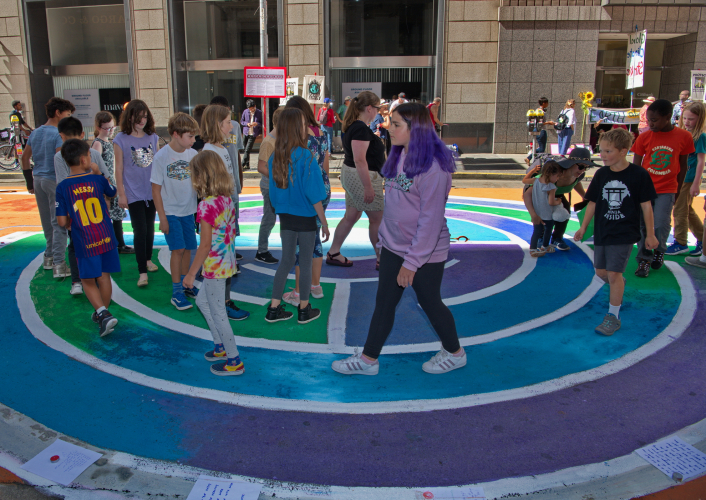 Thirteen environmental and social justice each painted a large "mural" on the roadway. There was even a painted maze for children walk through. Organizations represented were: