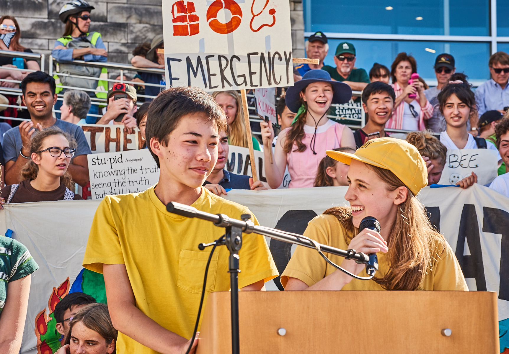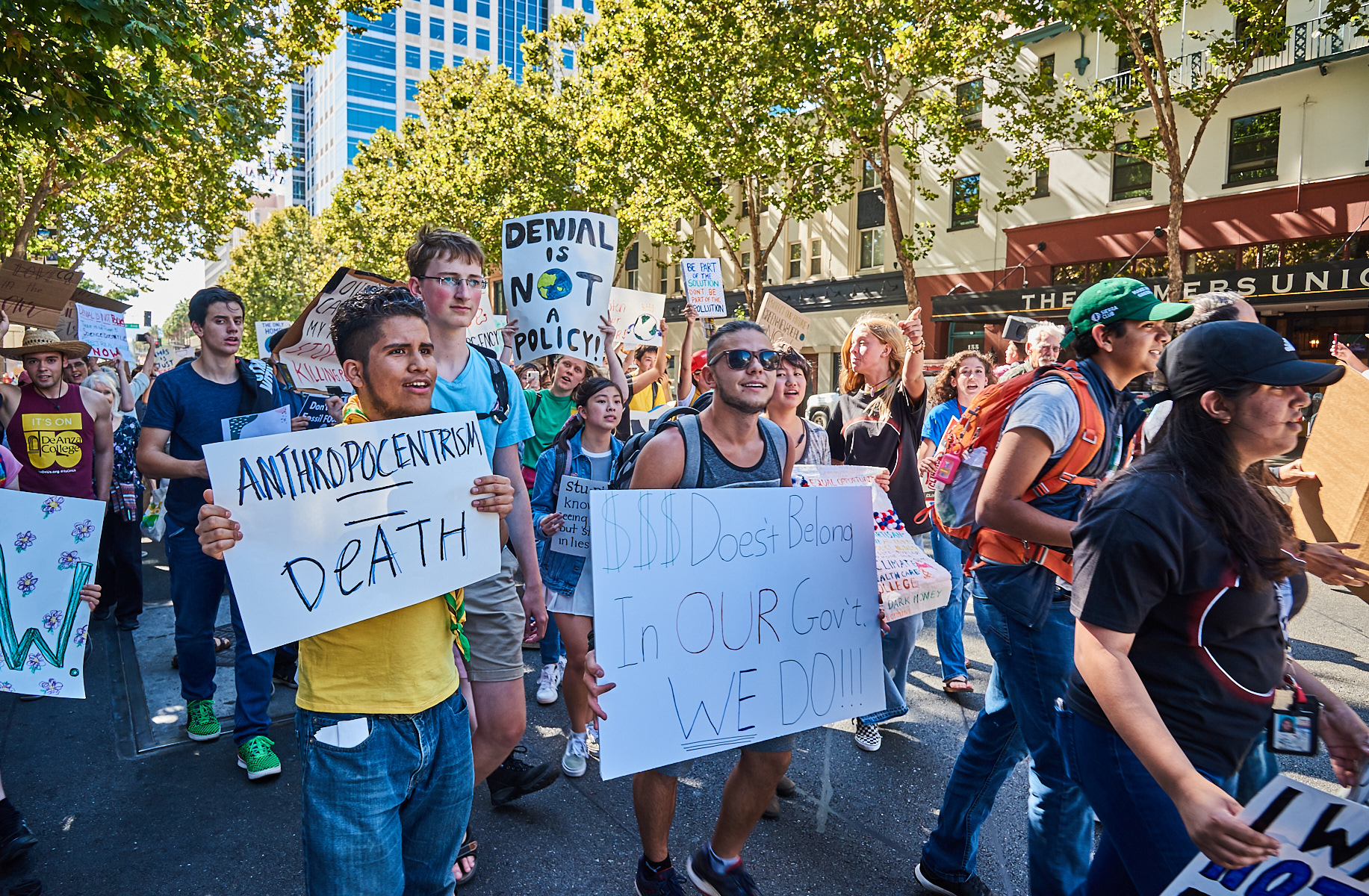 A student carried a sign along the march that read "I'm running for City Council at 19 years old because we don't have time." Another clearly seeks system change with a sign that said, "It's Capitalism That Caused This--not lawns, not plastic, not long showers..."