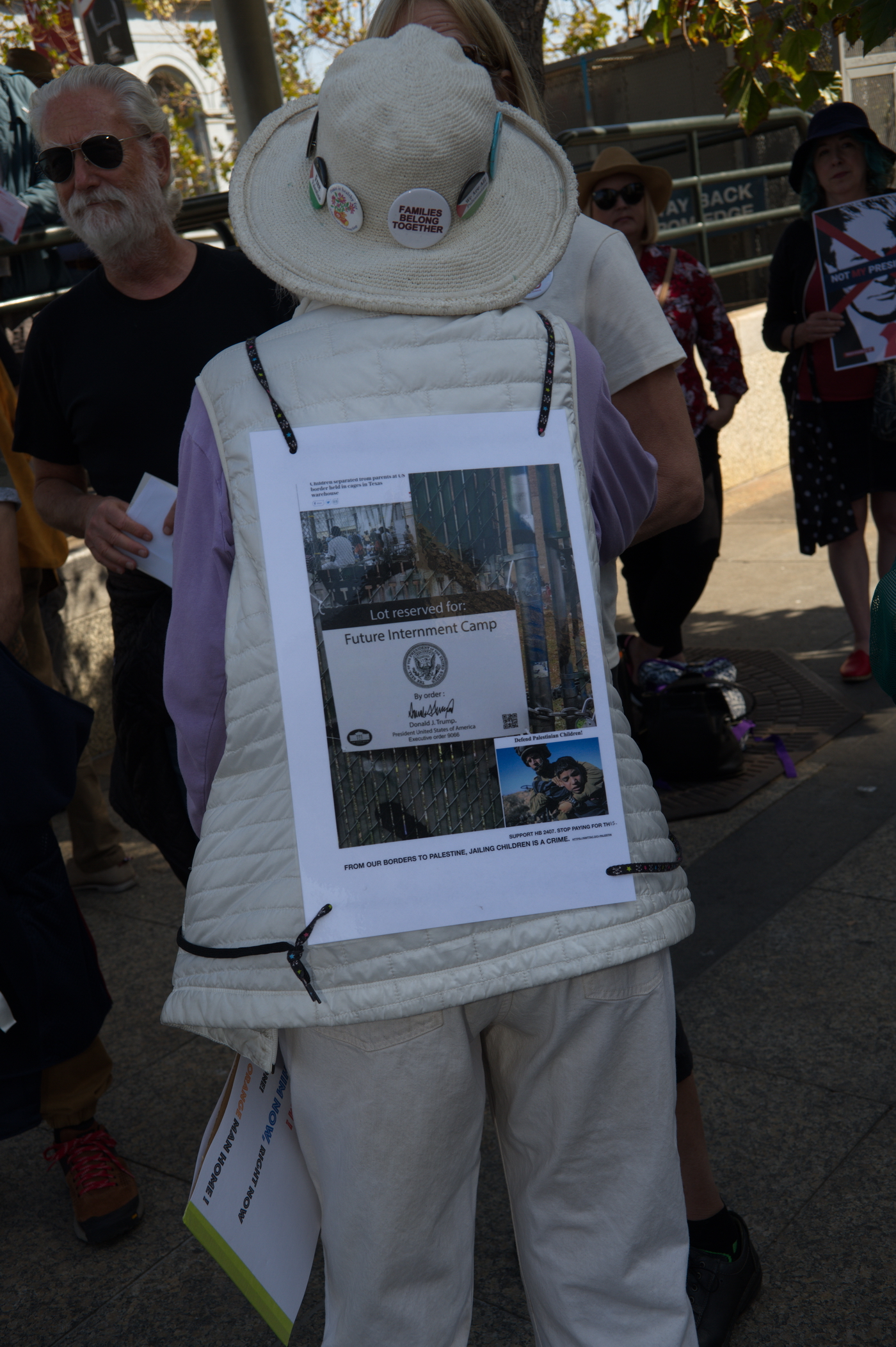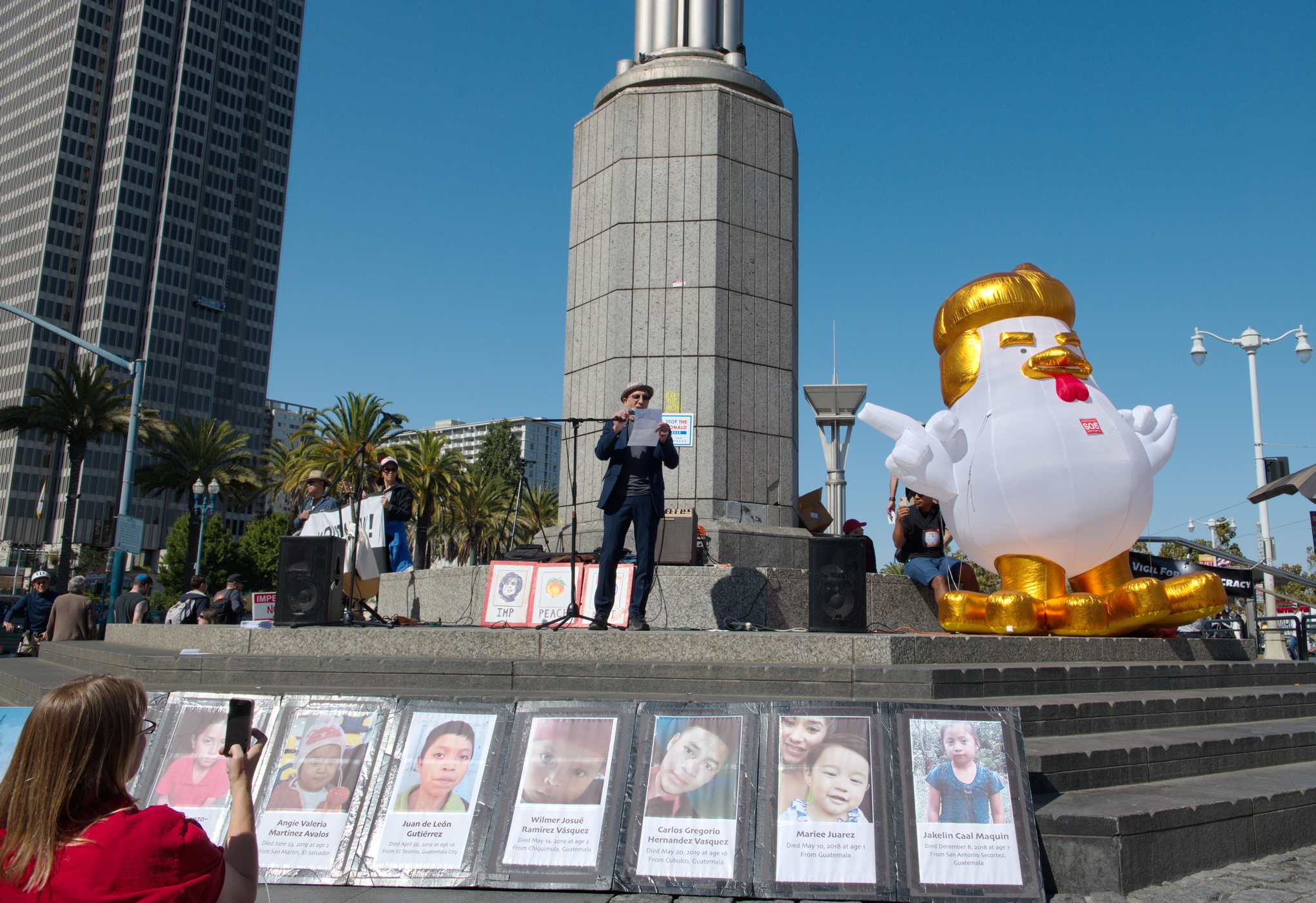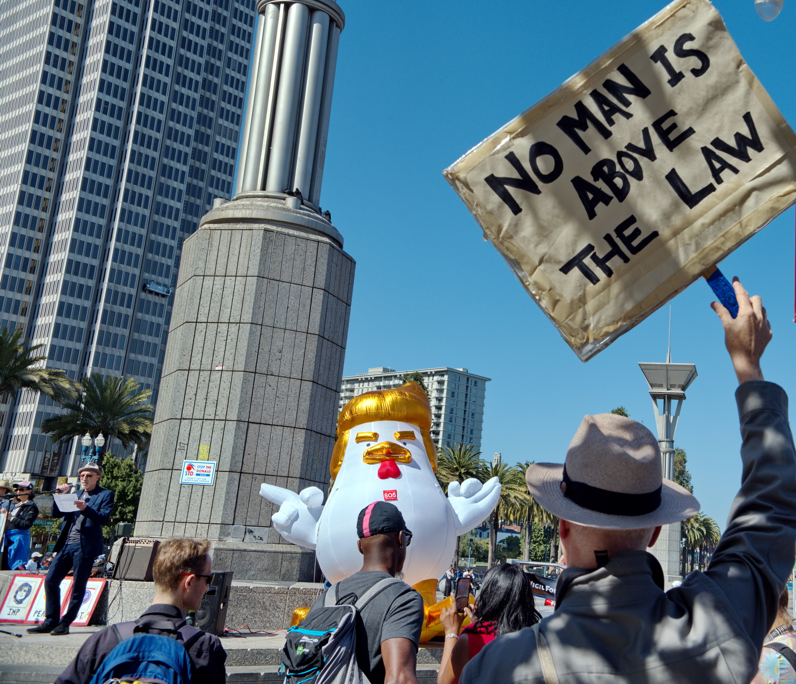 In addition to accommodating tracks and stops for San Francisco’s reborn trolley car system, skate boarders, street musicians and that symbol of our shared prosperity, the homeless, there are platforms supporting two gigantic Nuremberg rally style vertical torches that provided ideal event stages for the protest rally.