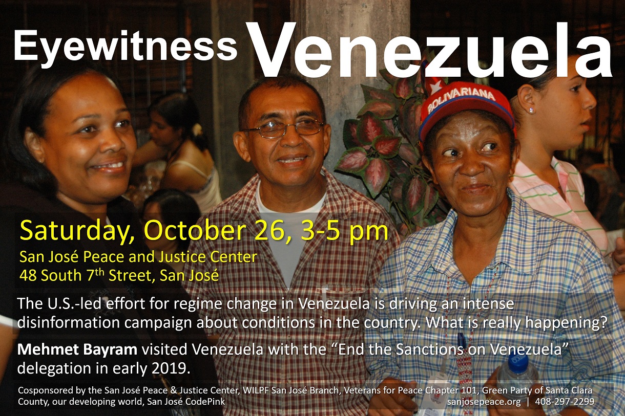 Cosponsored by the San José Peace & Justice Center, WILPF San José Branch, Veterans for Peace Chapter 101, Green Party of Santa Clara County, our developing world, and San José CodePink