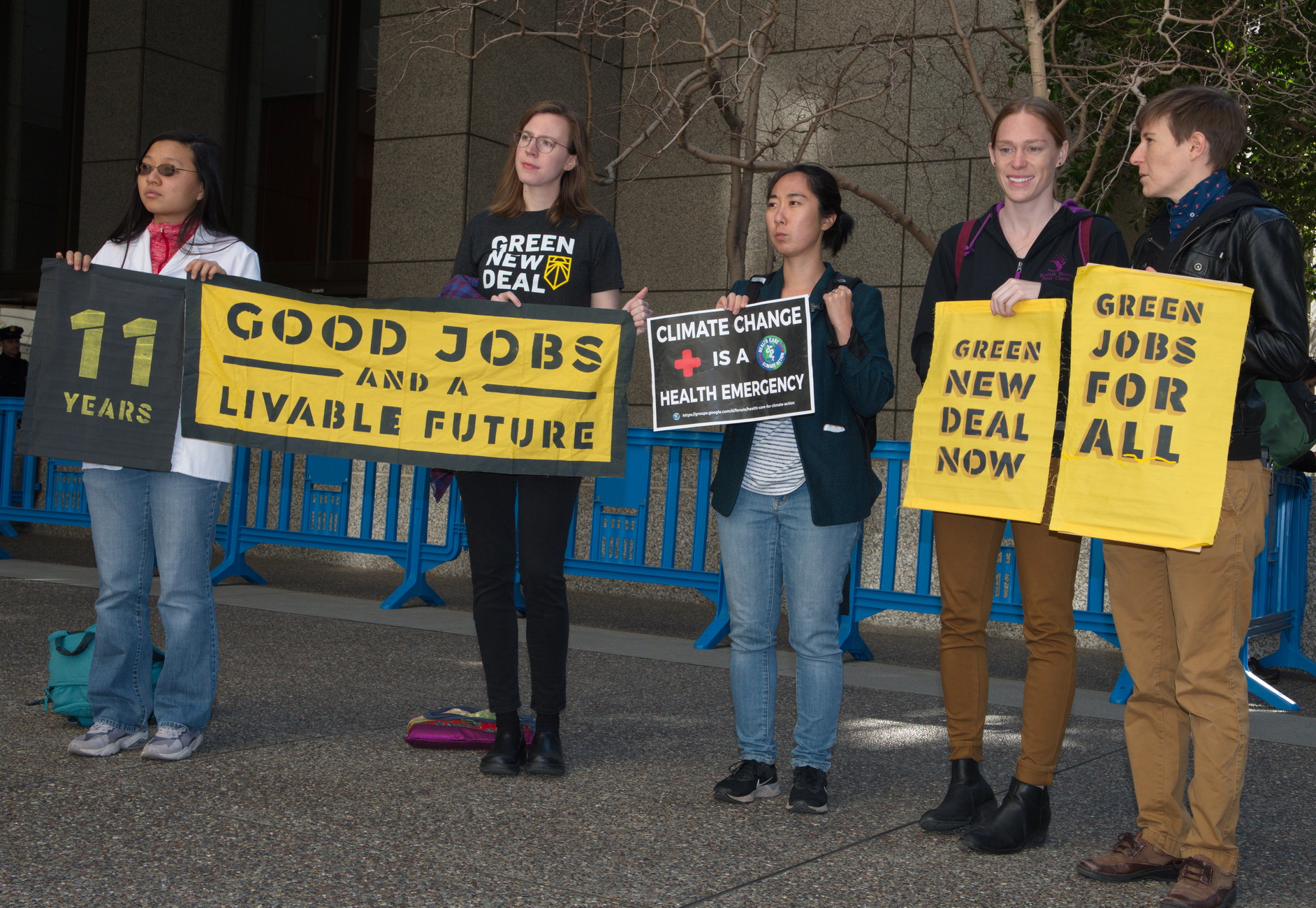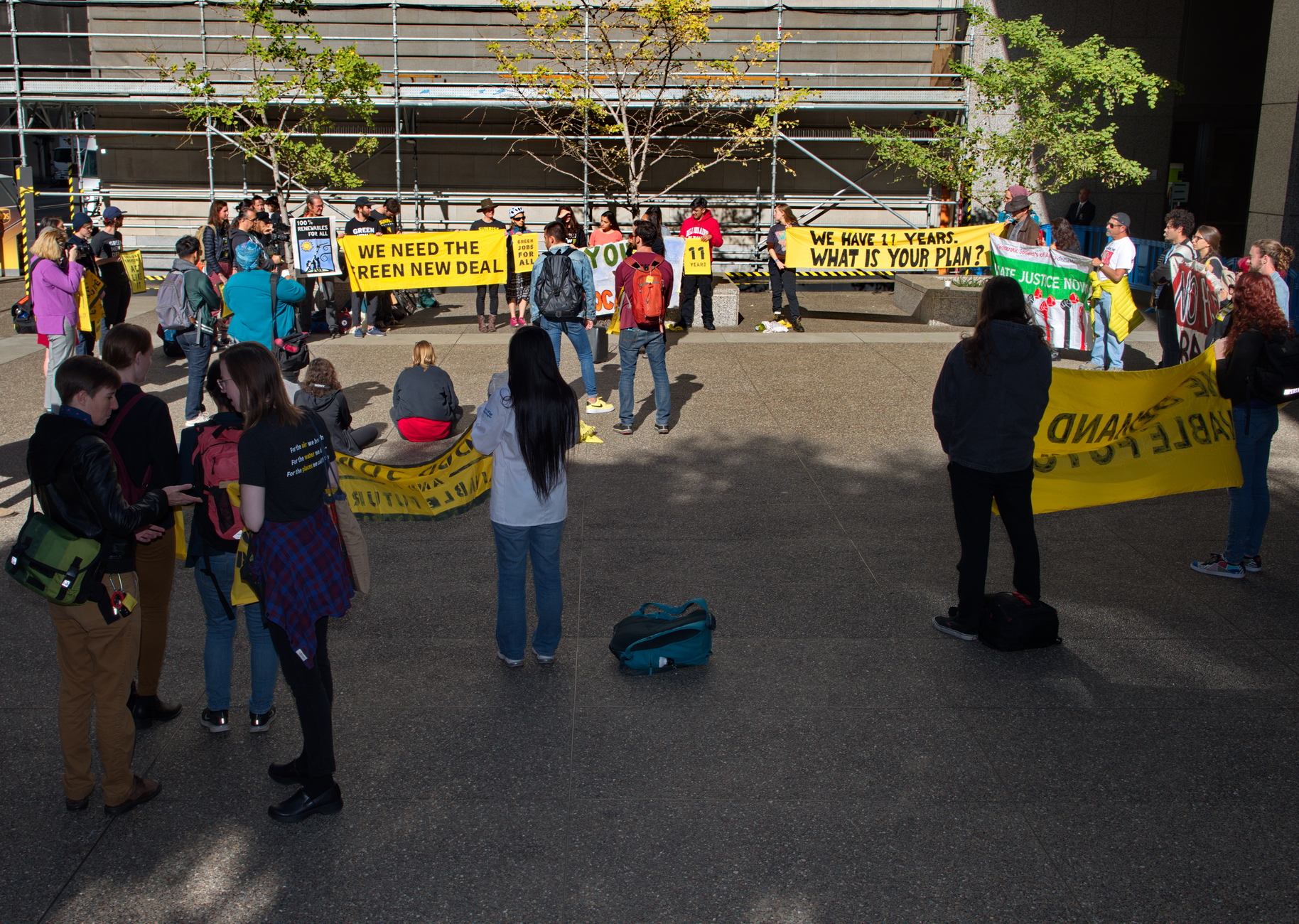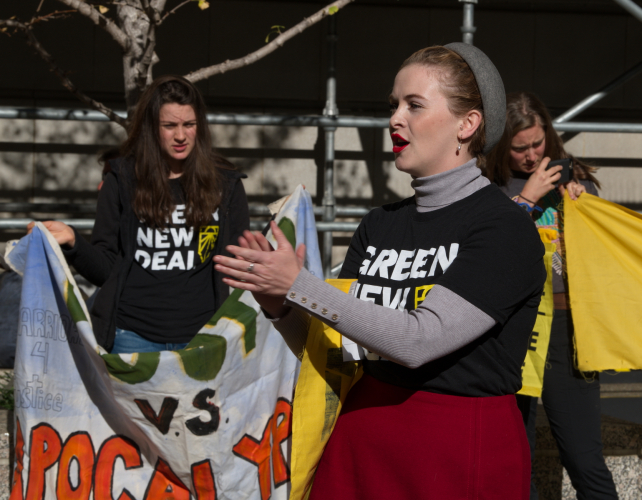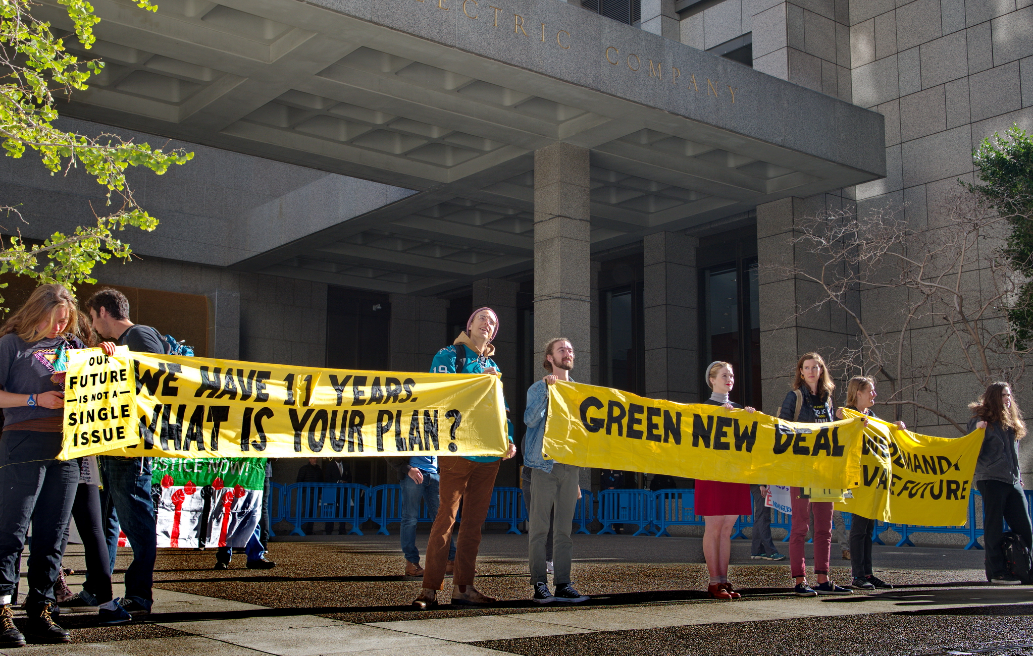 They demanded a Green New Deal and the end of PG&E's way of doing business. Speakers told their stories of evacuations and blackouts. Demonstrators held posters promoting green new jobs and warning that times was running out.