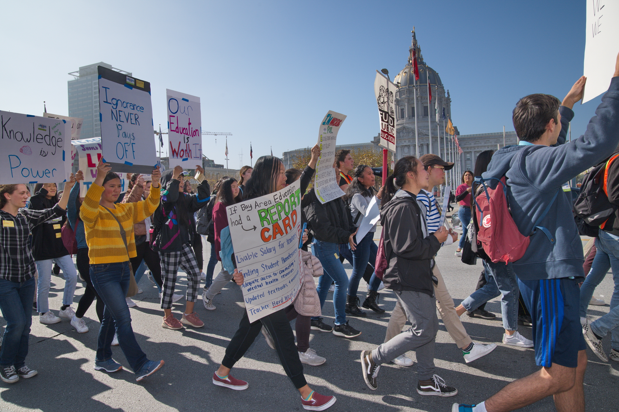 Named "GEN-Up" and student led, the group has previously marched against gun violence, for gender equality and for the climate. This time, marching from a rally at San Francisco's public library and ending at the San Francisco school board offices, they posted their demands on the office windows.