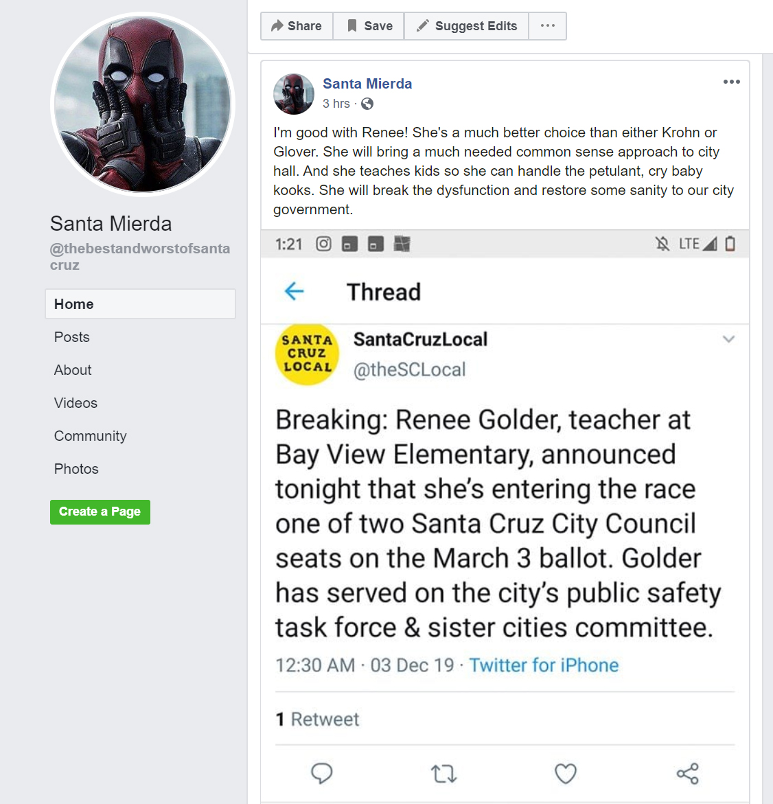 Steve Schlicht, the anonymous "Ben Dover" author of the Santa Mierda hate blog, has unofficially endorsed Republican Renee Golder on social media. Schlicht served along side Renee Golder on the City of Santa Cruz Citizen's Public Safety Task Force in 2013. In 2018, about 50% of the candidates Schlicht endorsed on the Santa Mierda blog were Republican. In 2018, Schlicht worked on the campaign for losing Santa Cruz City Council Candidate Ashley Scontriano, who is also a Republican.