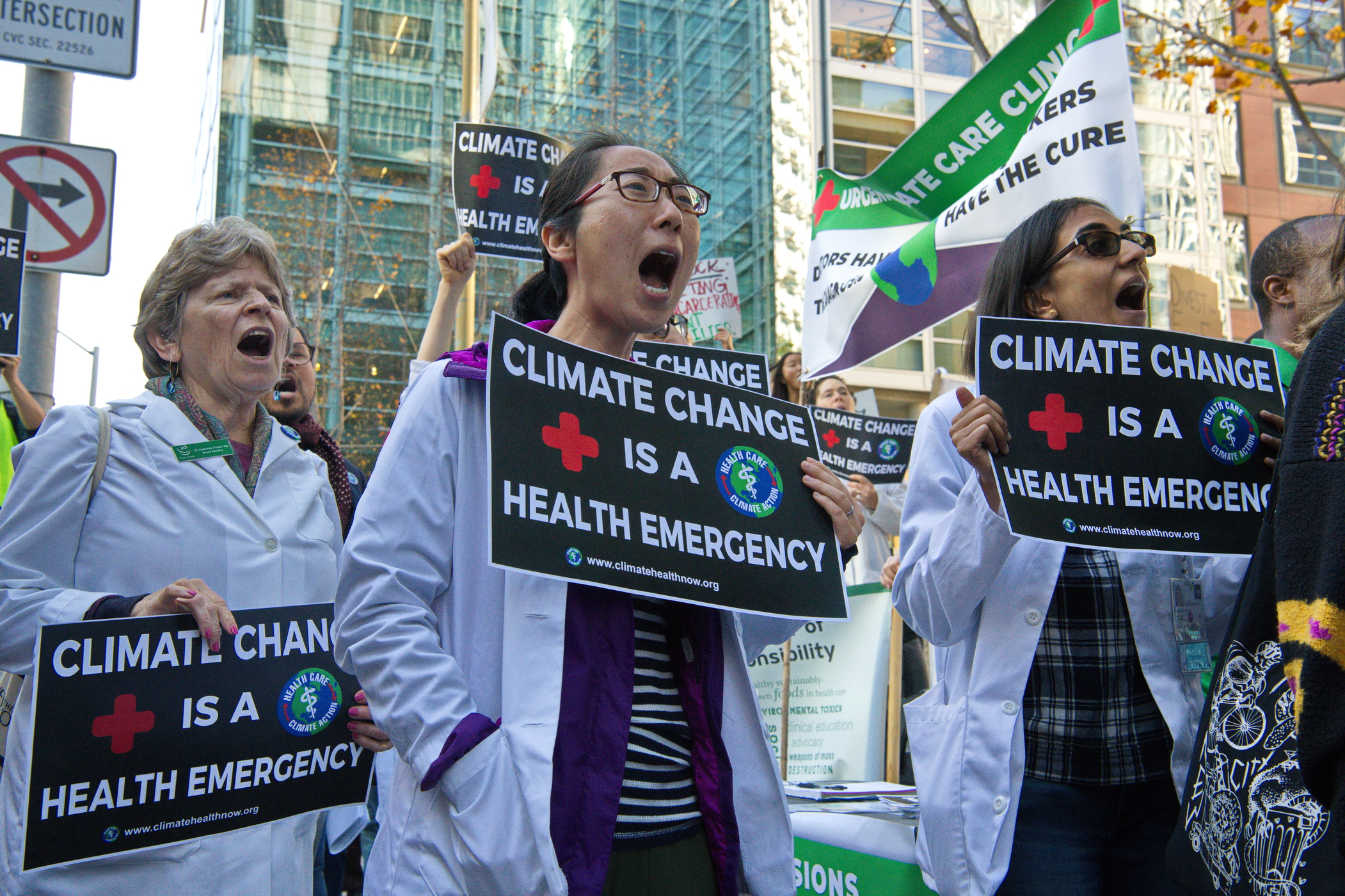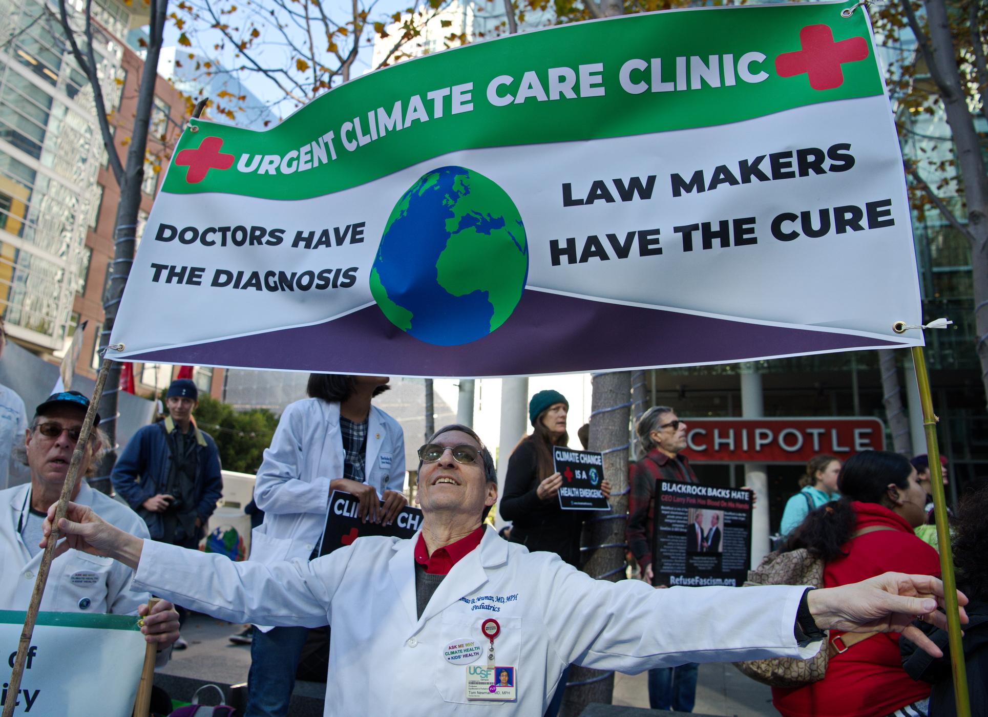 The protest’s organizers included Youth vs Apocalypse, Green New Deal, Extinction Rebellion, 350 Silicon Valley, and UCSF doctors belonging to Physicians for Social Responsibility.