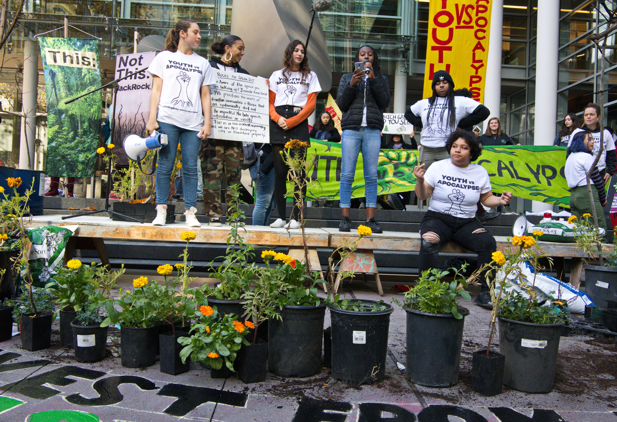 Along with signs, speeches, and slogans, protesters created a display of potted flowers and painted a divestment demand on the street.